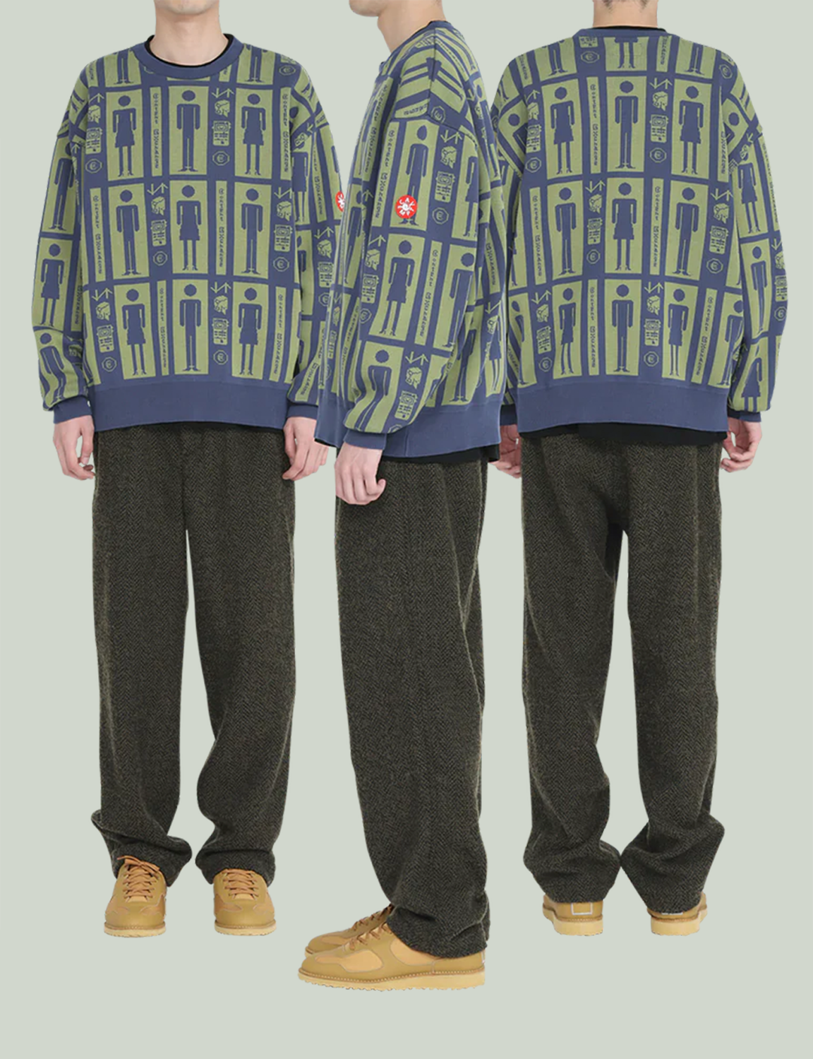クルーネック。ジャカード編みで全面にグラフィック。