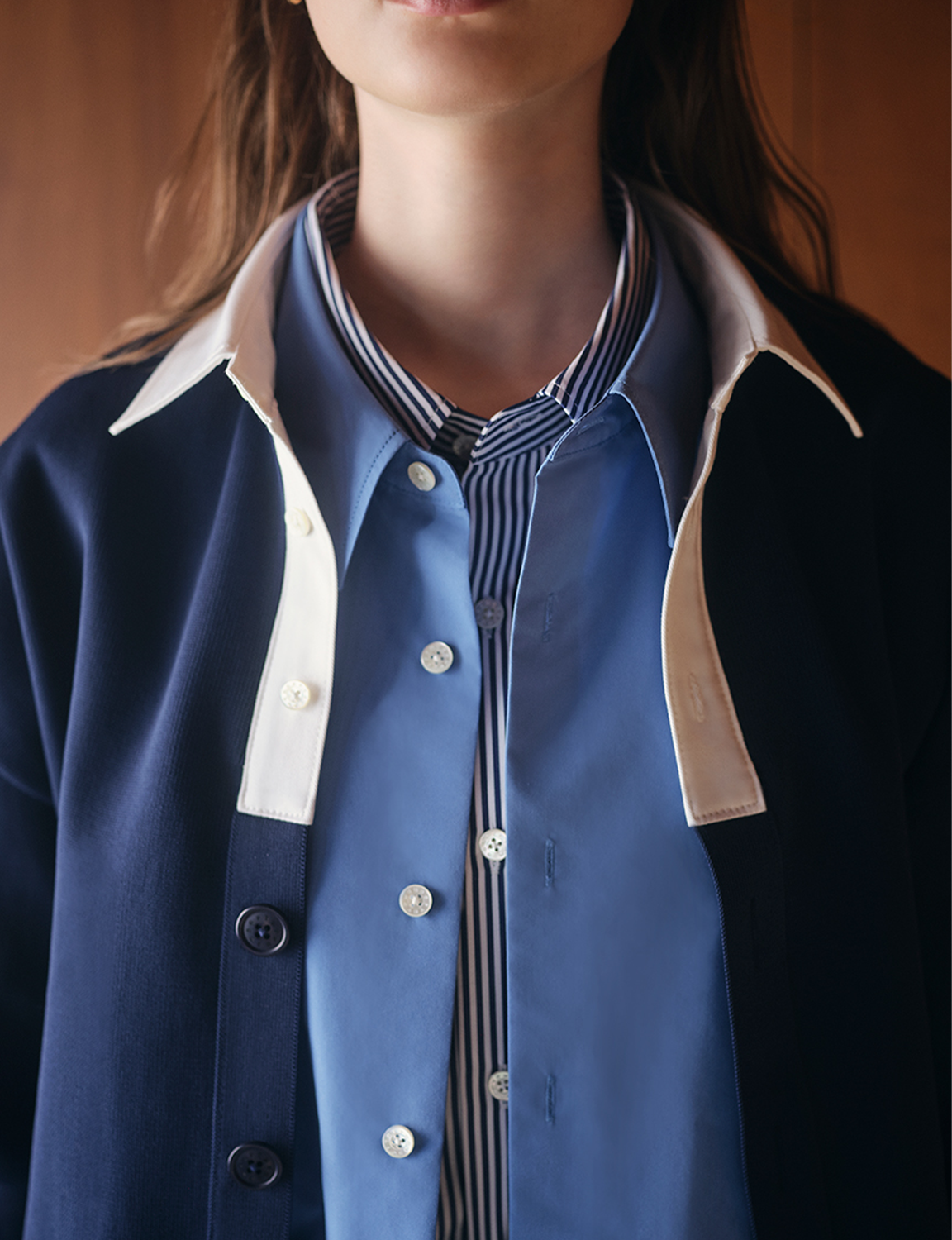 Front and collar: double-layered Cuffs: adjustable in two sizes with buttons Oversized silhouette shirt with tucks in the back yoke
