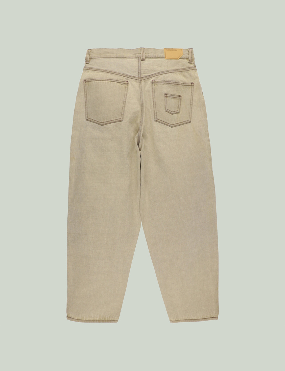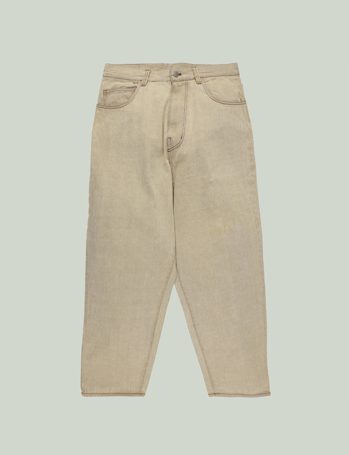 PHINGERINの定番ジーンズ、スタンダードな5ポケット + バックレフトの中央にタイニーなバックポケットがパッチされた"6 POKCKET JEANS" 、 素朴ですが、6つ目のポケットがとても強いディテール。定番インディゴシリーズ、ブラックに加えて、ブリーチ&ダイを施したベージュカラー。 それぞれコントラストするステッチで仕上げています。バックポケットは少しドロップめに配置されているおりバックポケットを見せるようなスタイリングもおすすめ、ルーズに履いてもクリーンな雰囲気をキープできるテーパーシルエット。