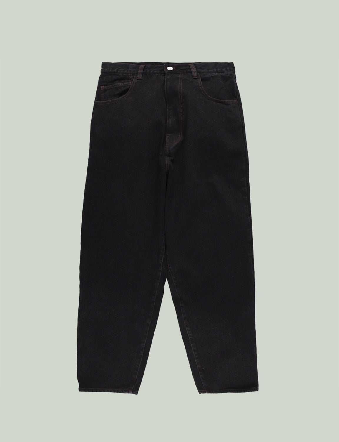 PHINGERINの定番ジーンズ、スタンダードな5ポケット + バックレフトの中央にタイニーなバックポケットがパッチされた"6 POKCKET JEANS" 、 素朴ですが、6つ目のポケットがとても強いディテール。定番インディゴシリーズ、ブラックに加えて、ブリーチ&ダイを施したベージュカラー。 それぞれコントラストするステッチで仕上げています。バックポケットは少しドロップめに配置されているおりバックポケットを見せるようなスタイリングもおすすめ、ルーズに履いてもクリーンな雰囲気をキープできるテーパーシルエット。