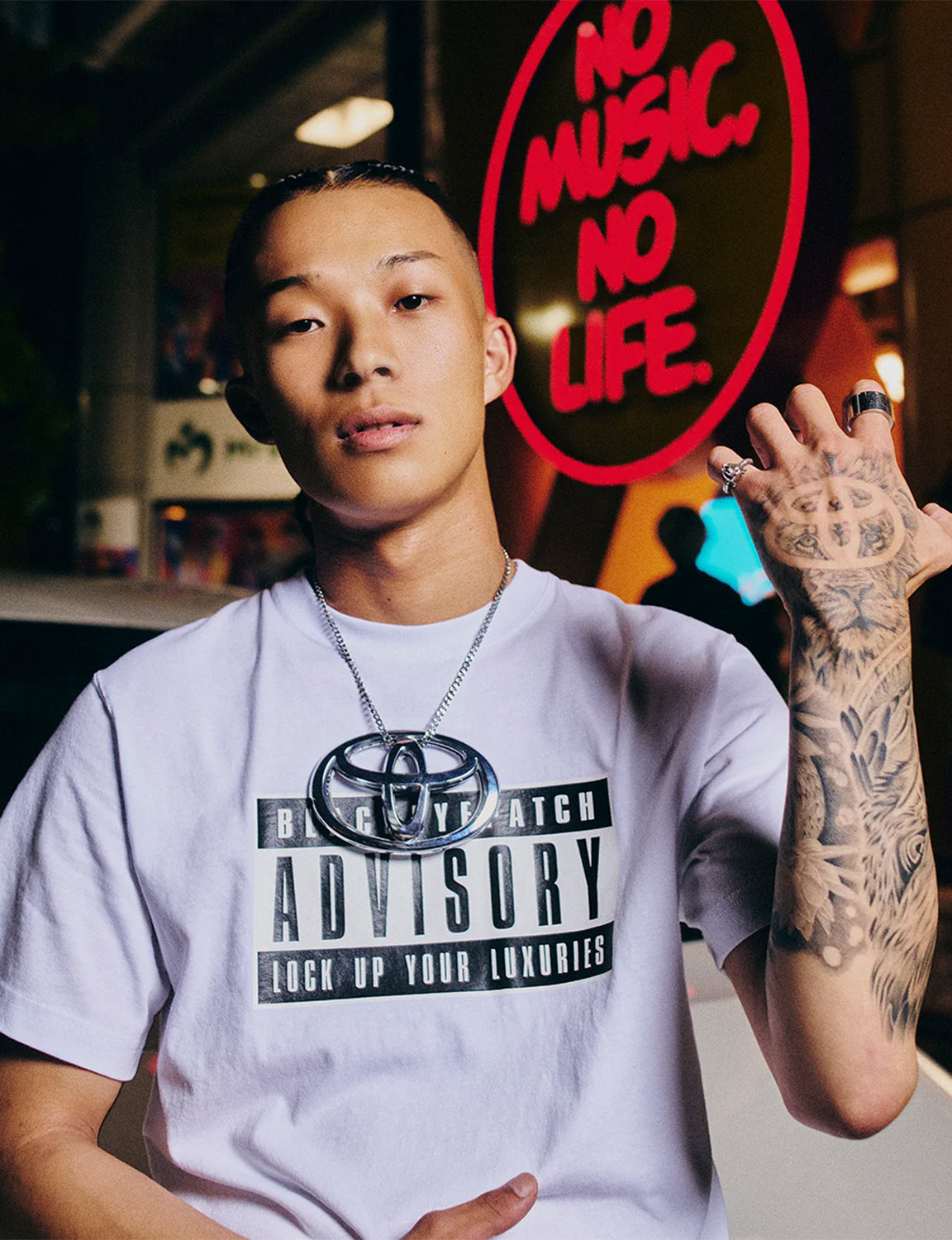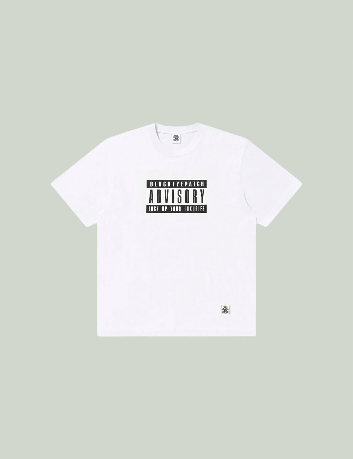 全米レコード協会(RIAA)によるペアレンタル・アドバイザリーのラベルにブランド名やメッセージをサンプリングしたグラフィックをプリントした T シャツ。