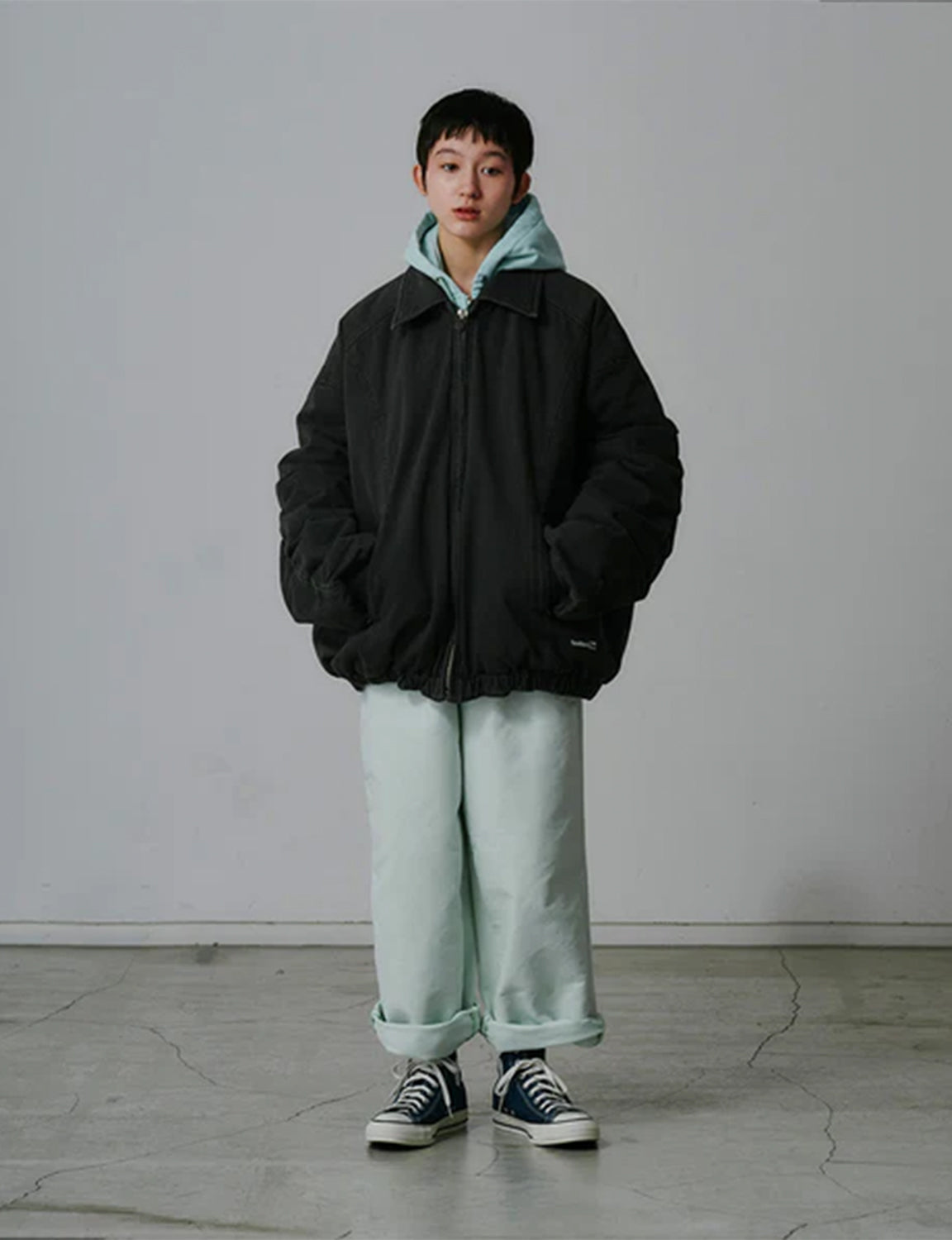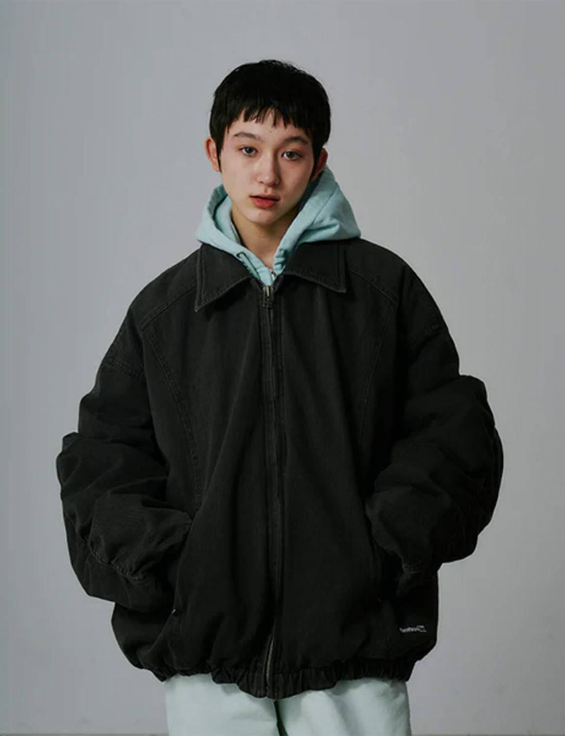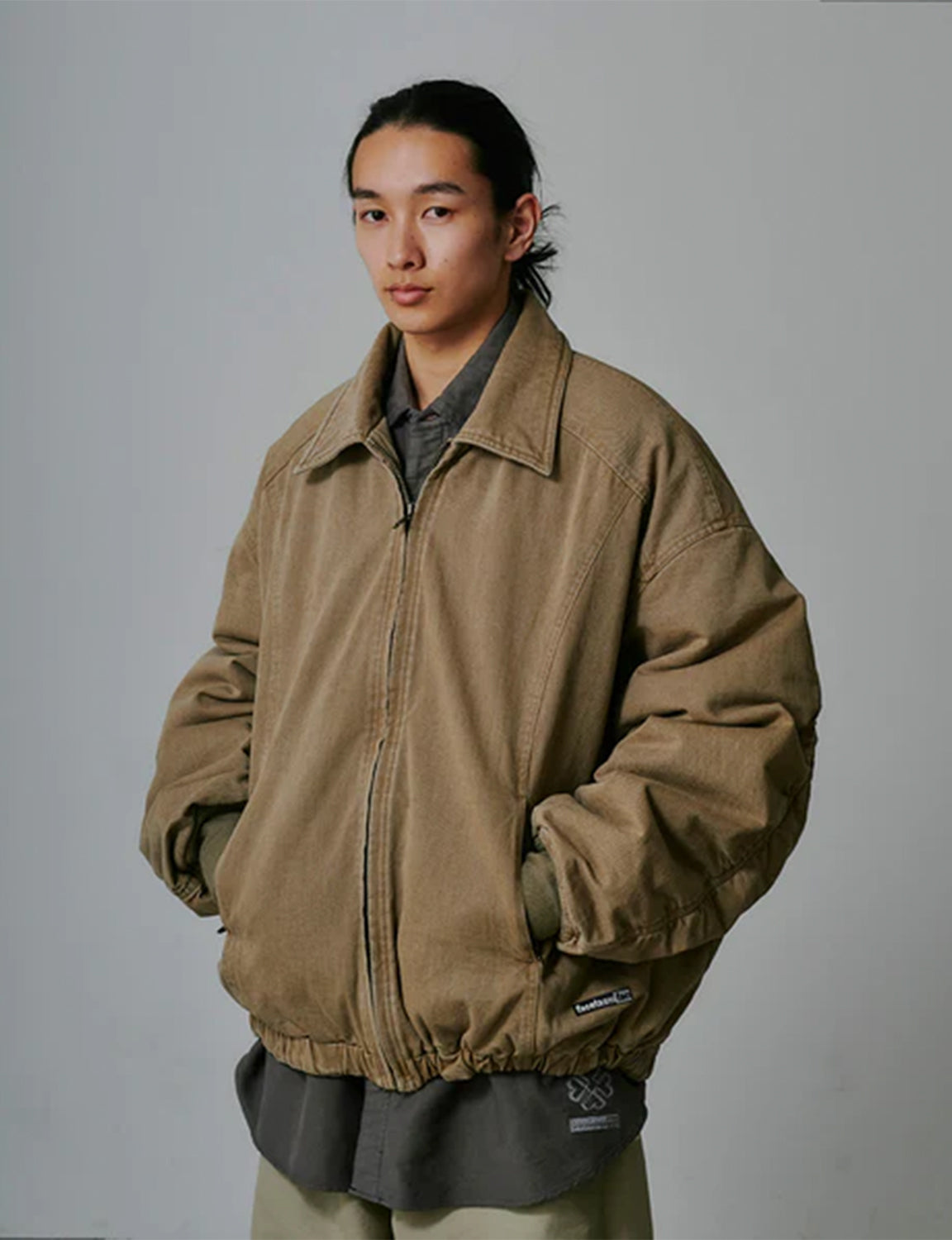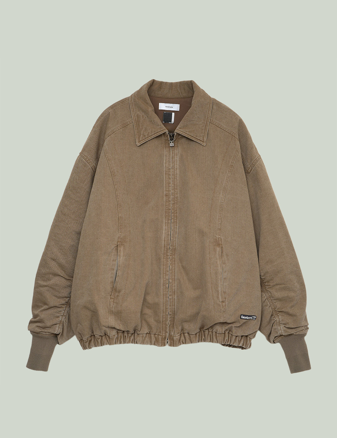 タテ糸とヨコ糸で異なる染色を施し、奥行きのある色合いを表現したカラーデニムを使用。さらにバイオウォッシュ加工を加えることで、素材の風合いをより際立たせています。デザインはFACETASM定番のオーバーサイズMA-1シルエットをベースに、襟を加えてブラッシュアップしたビッグジャケットです。