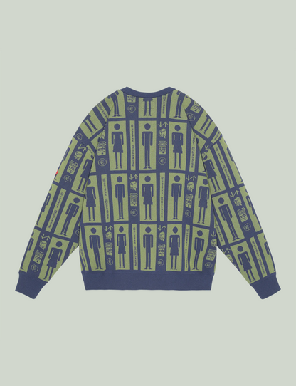 クルーネック。ジャカード編みで全面にグラフィック。