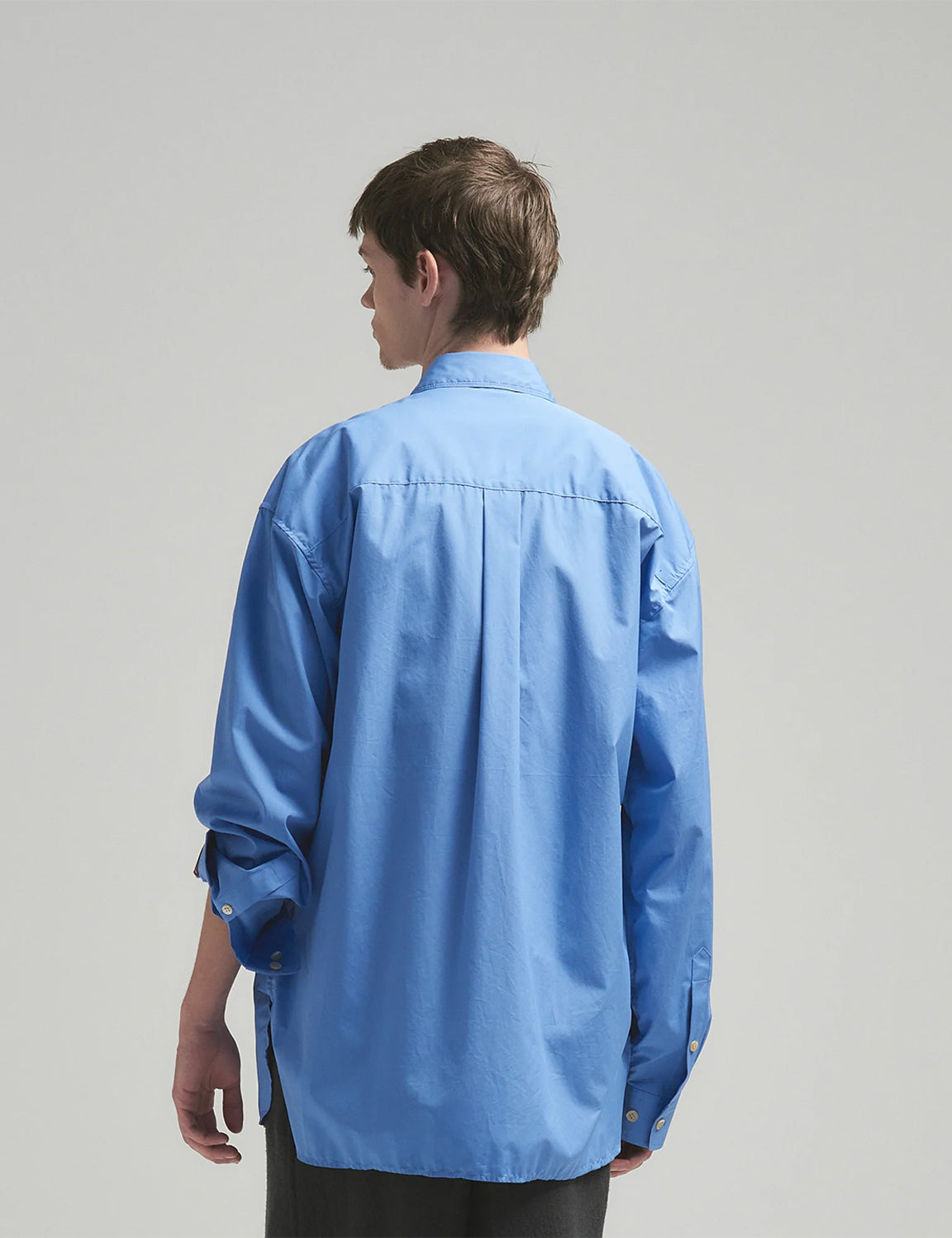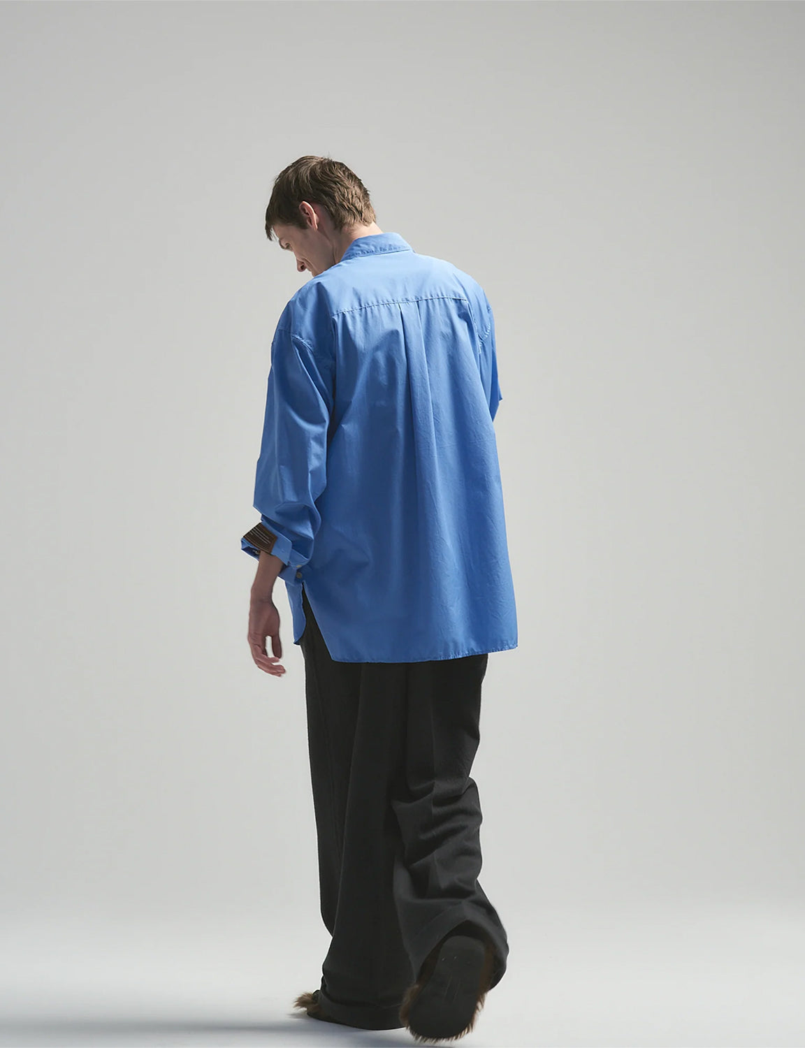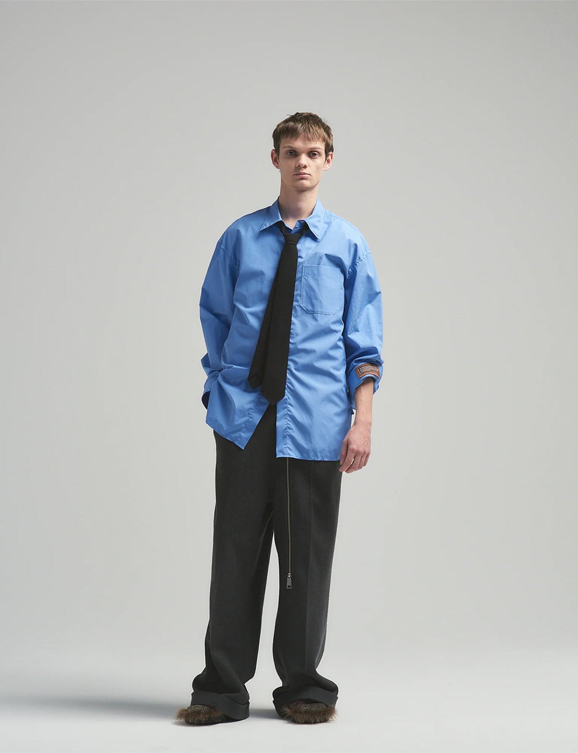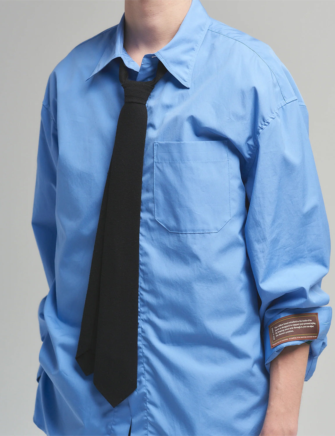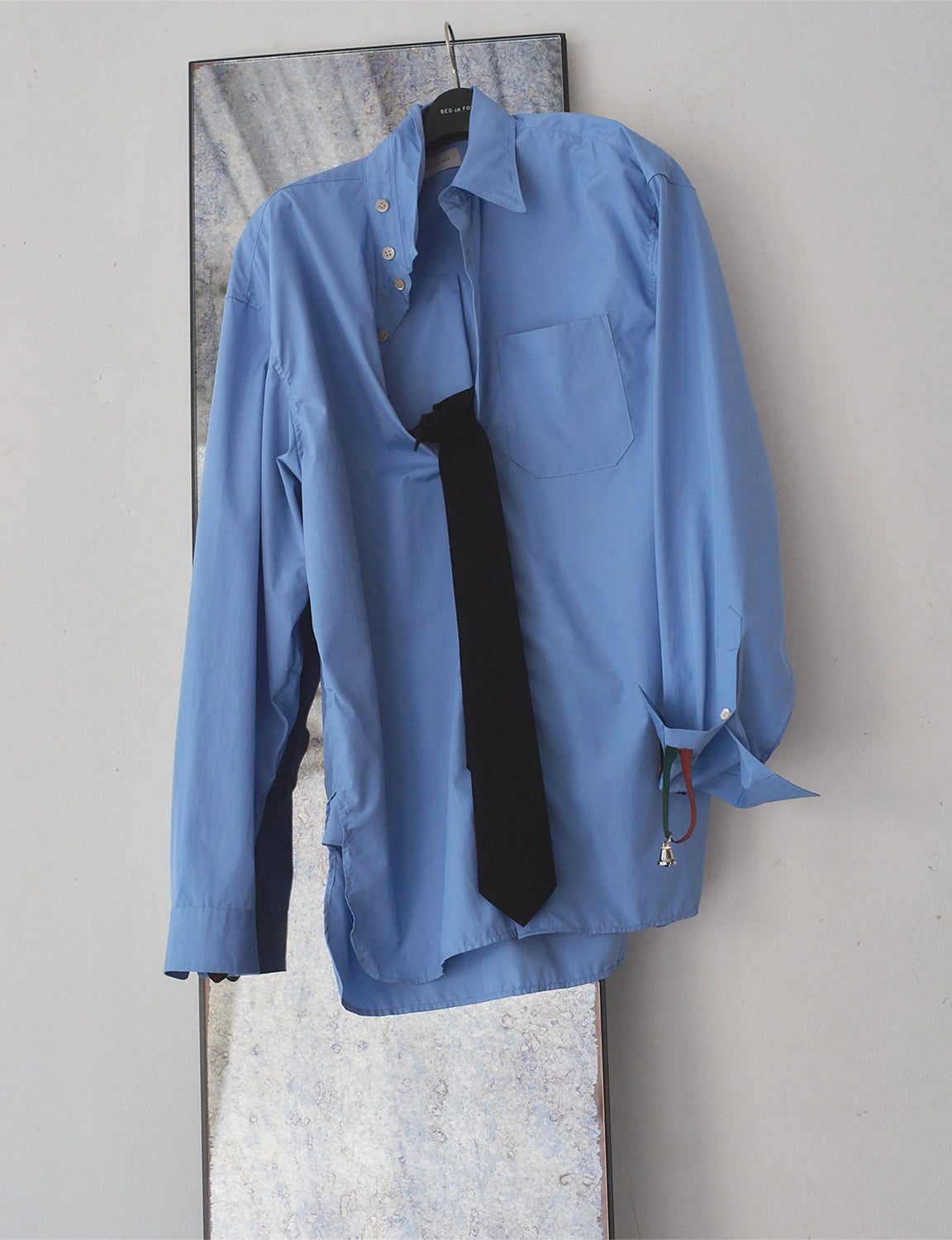 襟元のボタンでゆるさの2段階調整、そして取り外しも可能なネクタイ付きシャツ。今回は生地にイギリスのシャツブランド"THOMAS MASON"の生地を採用。上質な生地にあえて、パッカリングが入るように縫製し、表情のあるシャツに仕上げた。カフスを折り返す前提でネームもカフス裏に取り付け、スリーブは長めに設計。