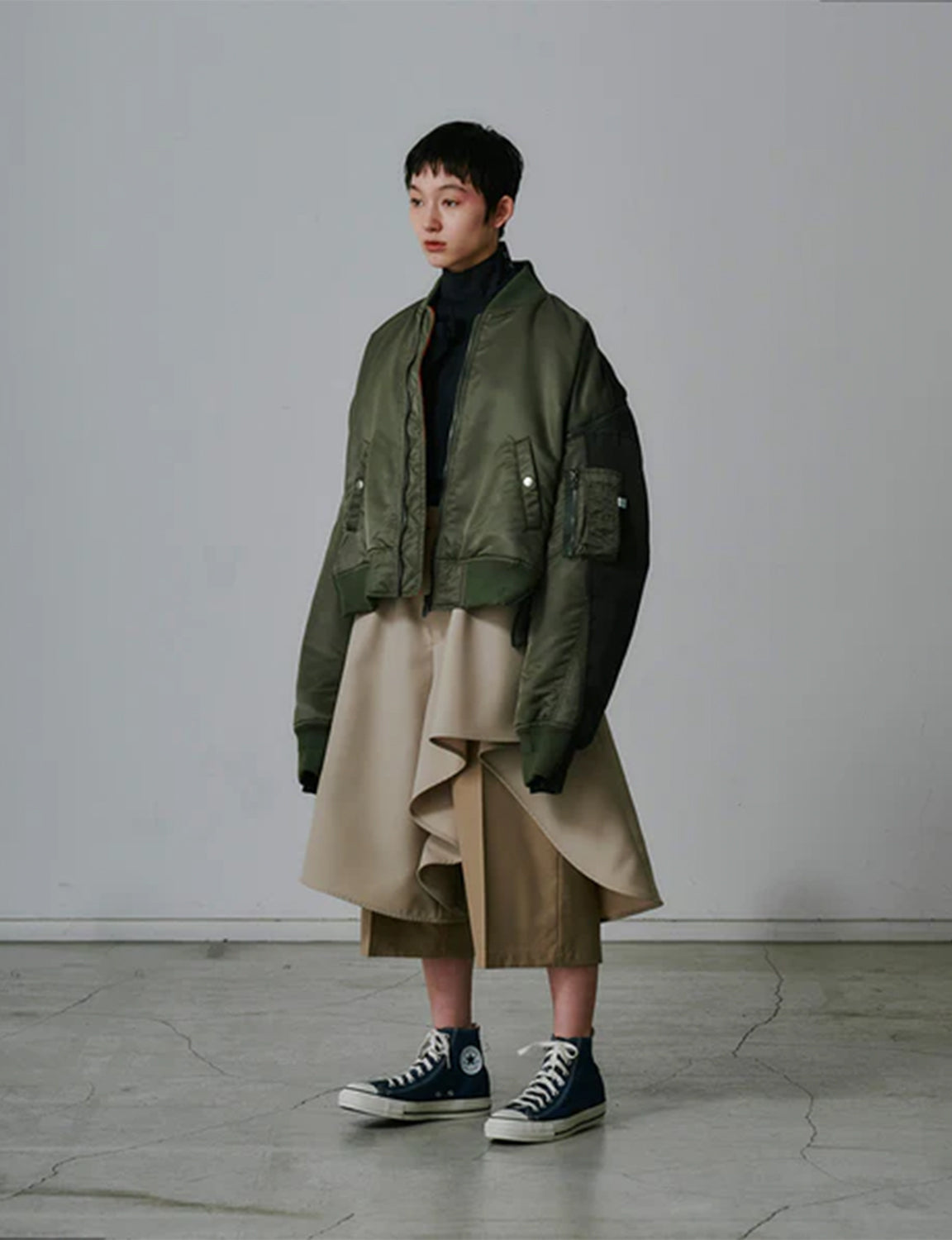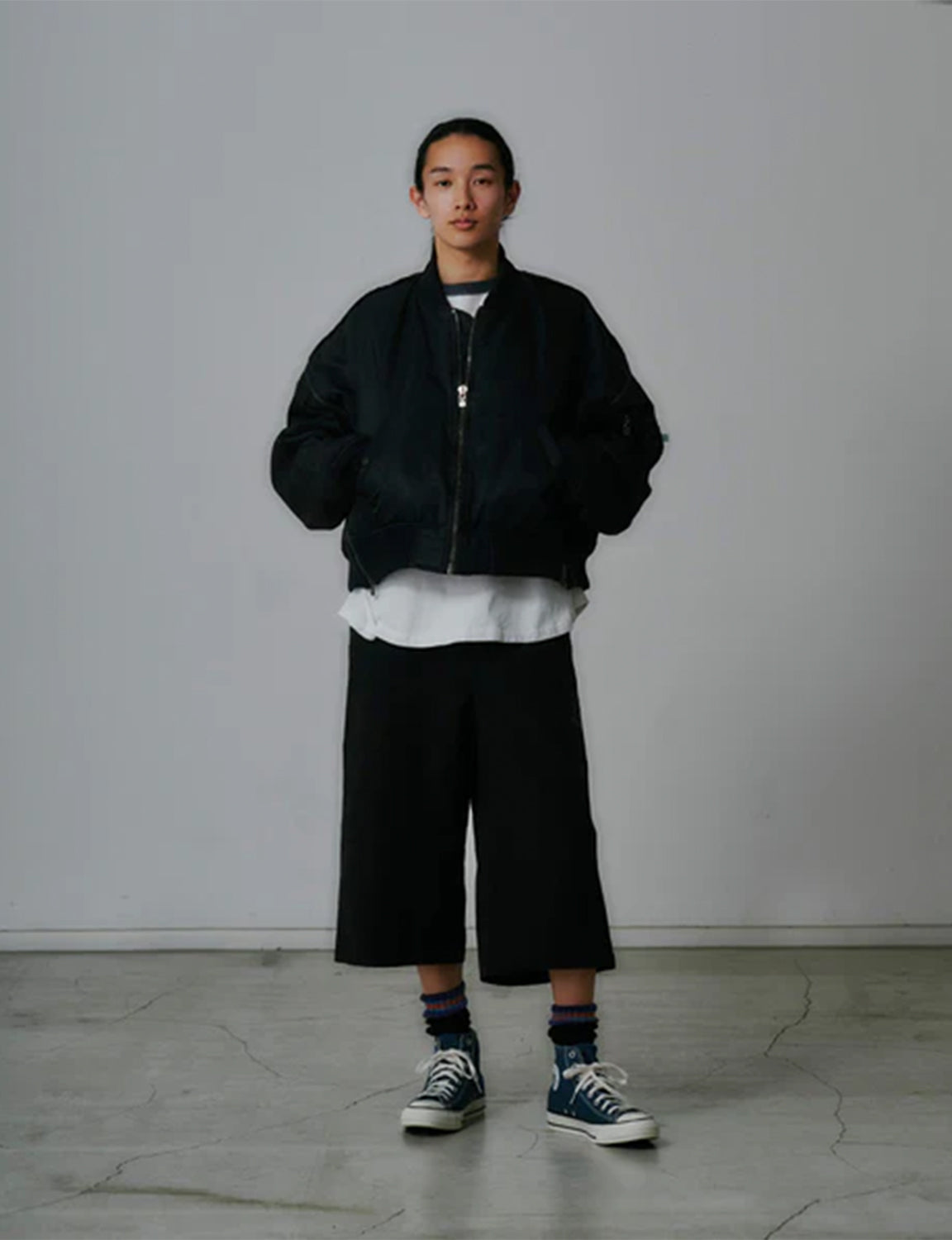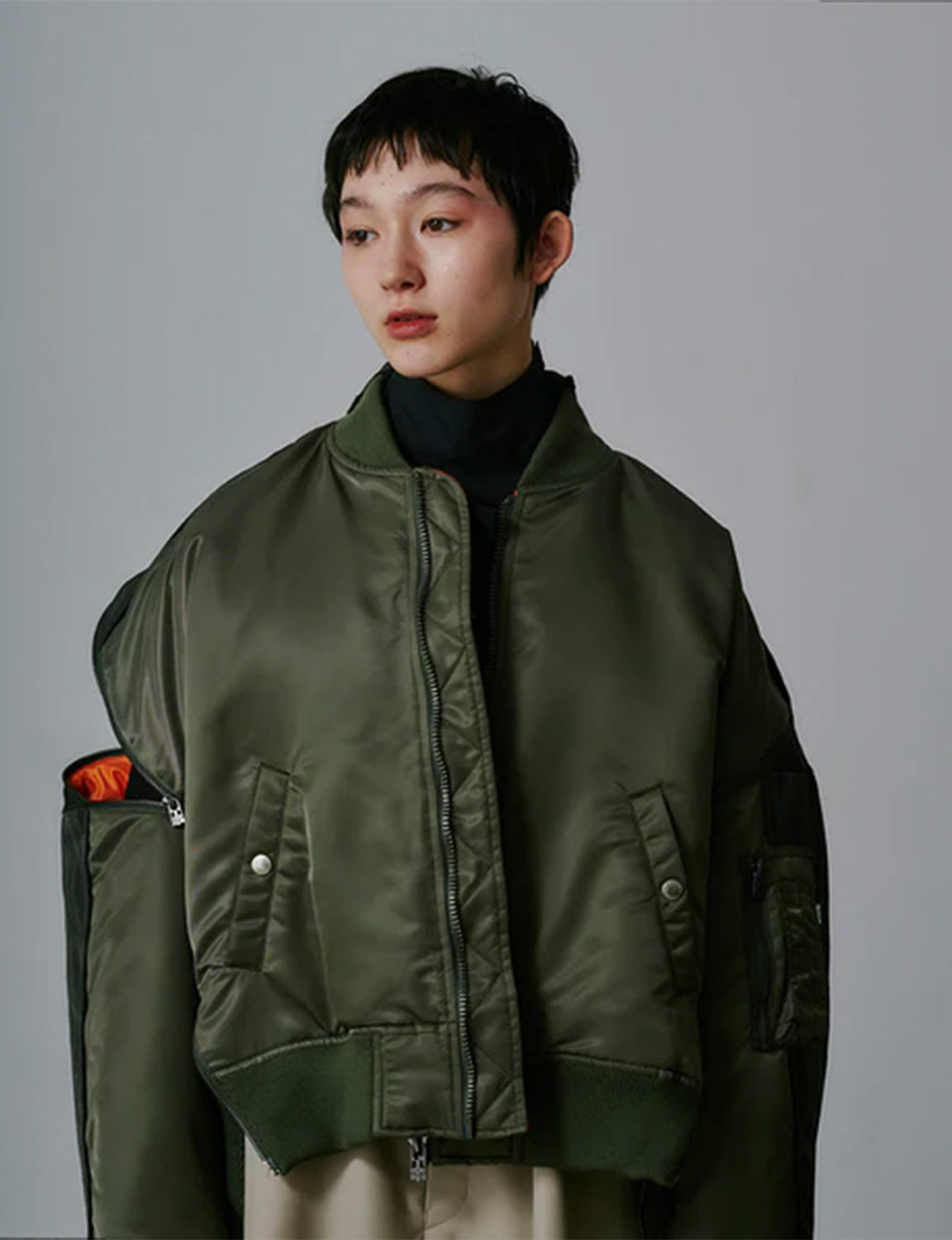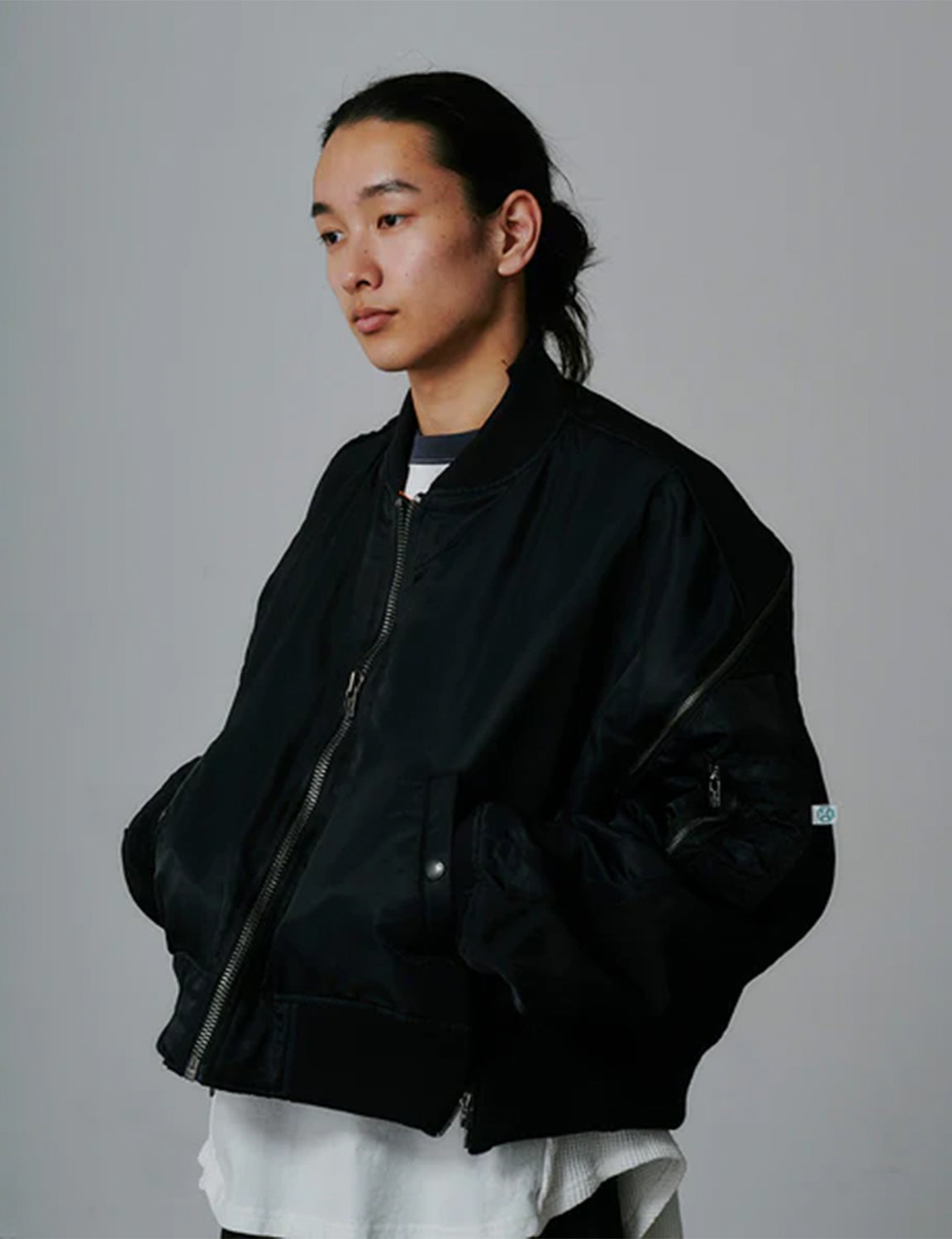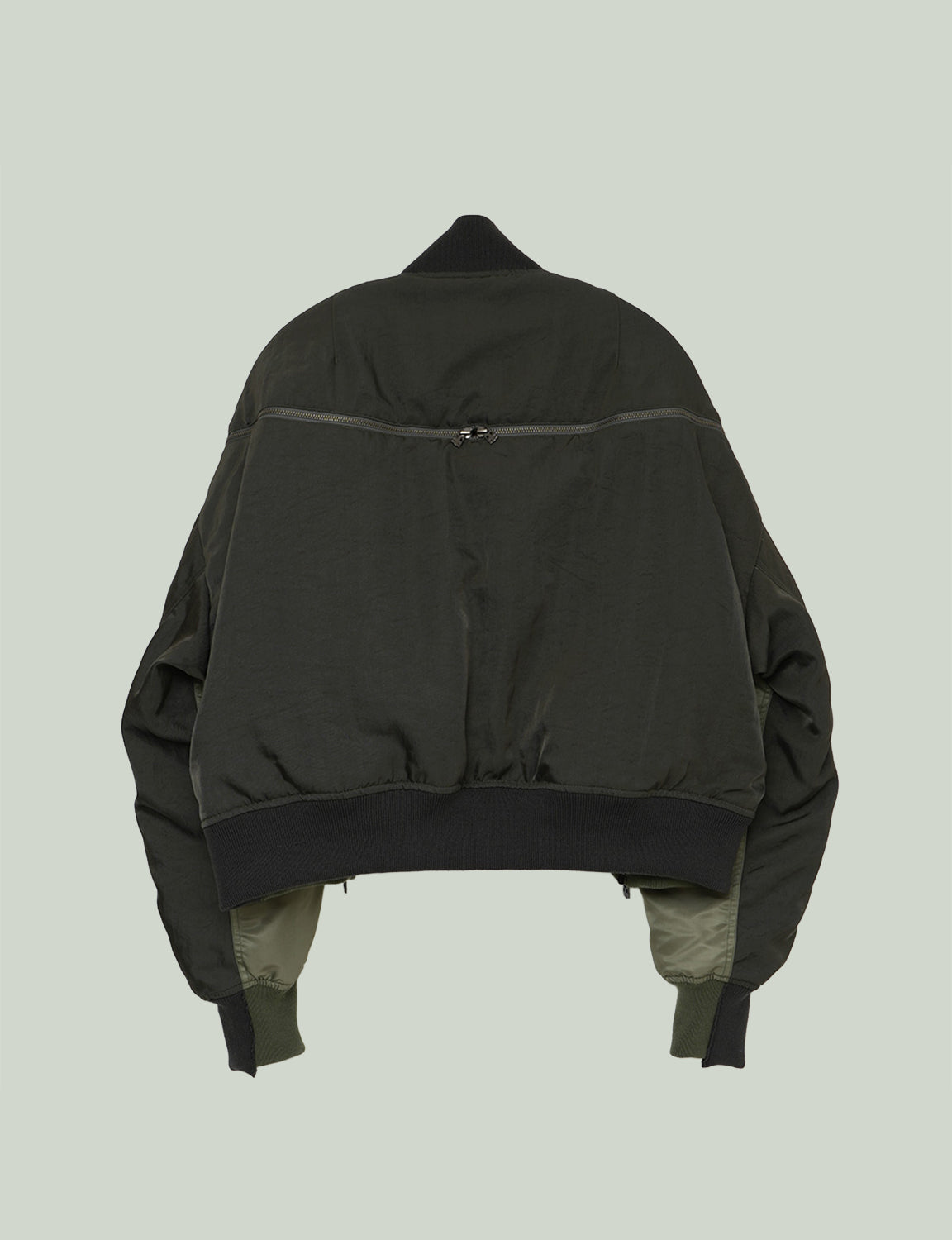 前身頃にはハリ感と光沢のあるナイロンタフタを、後身頃にはツイル目が際立つ重厚感のあるナイロンツイルを使用しています。デザインは定番のZIP MA-1をベースに、レイヤー風の切り替えディテールと裾のリブを加えてアップデートしています。