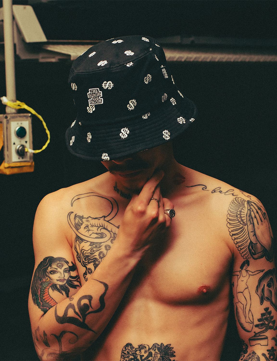 ブランドオリジナルのドルマークを総柄刺繍で表現したコットン生地のバケットハット。