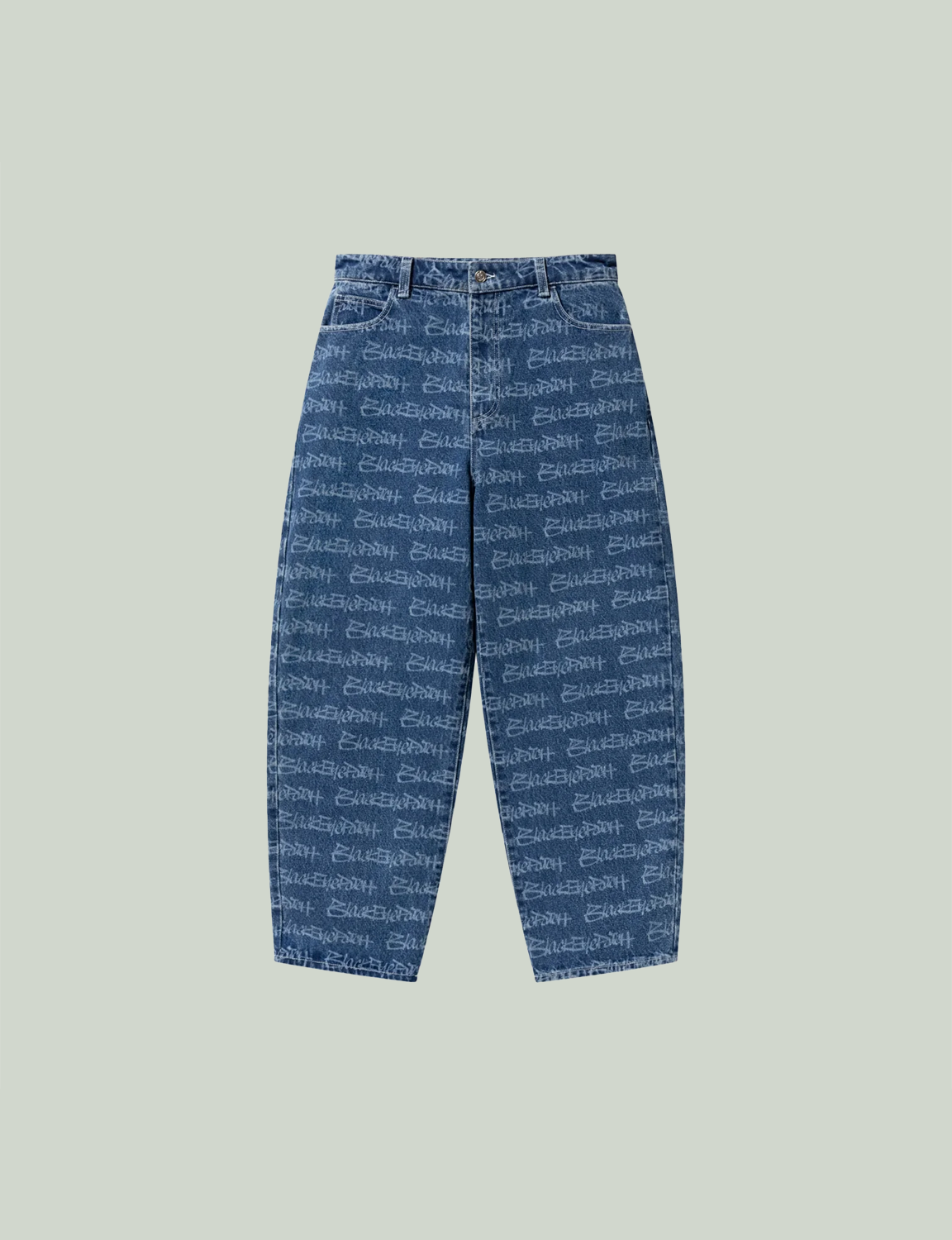 BEP のタグ調グラフィックをレーザープリントで施した総柄のエクストラバギージーンズ。