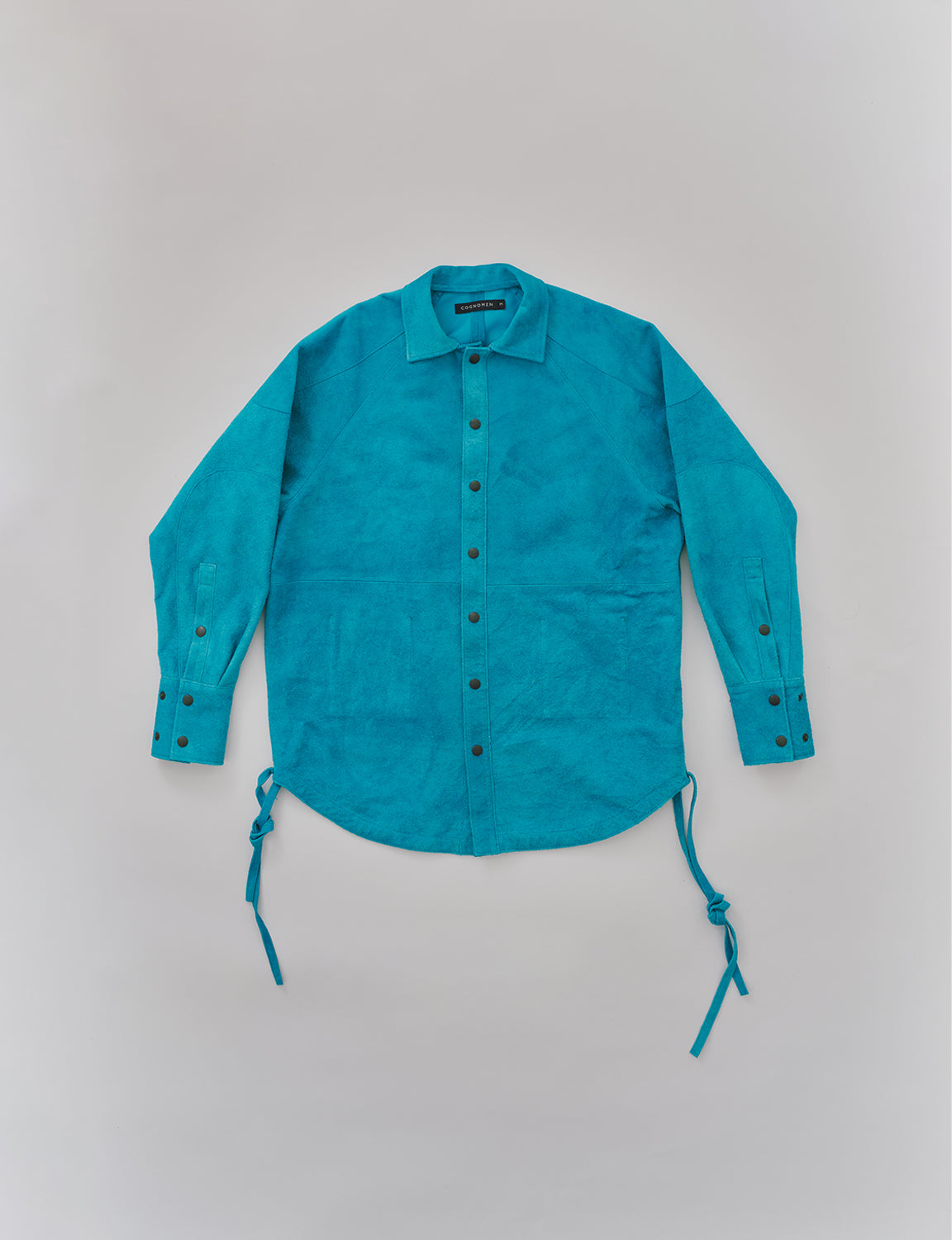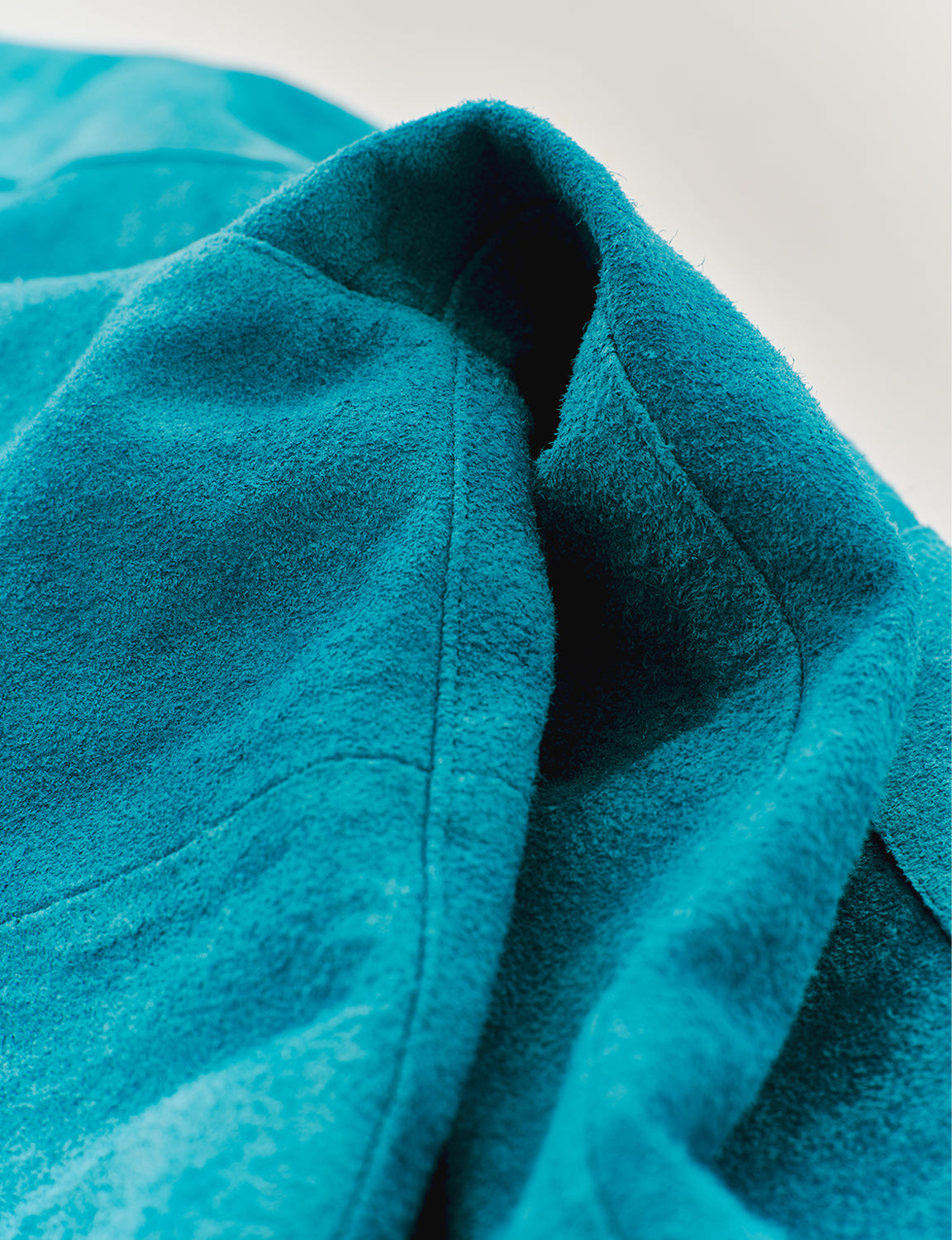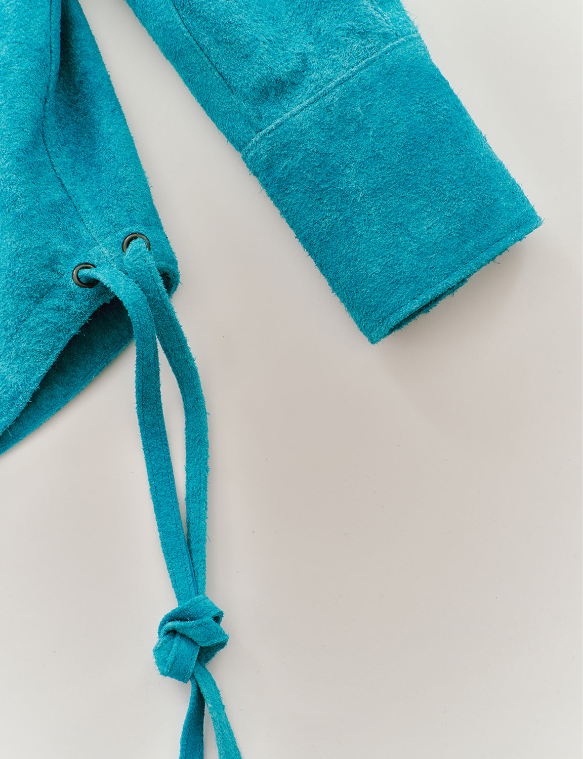 24SSから作り始めたゴールキーパーに着想を得たパターンを、 今回はターコイズ色のスエードで作りました。