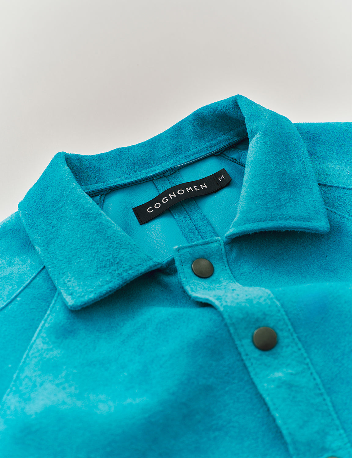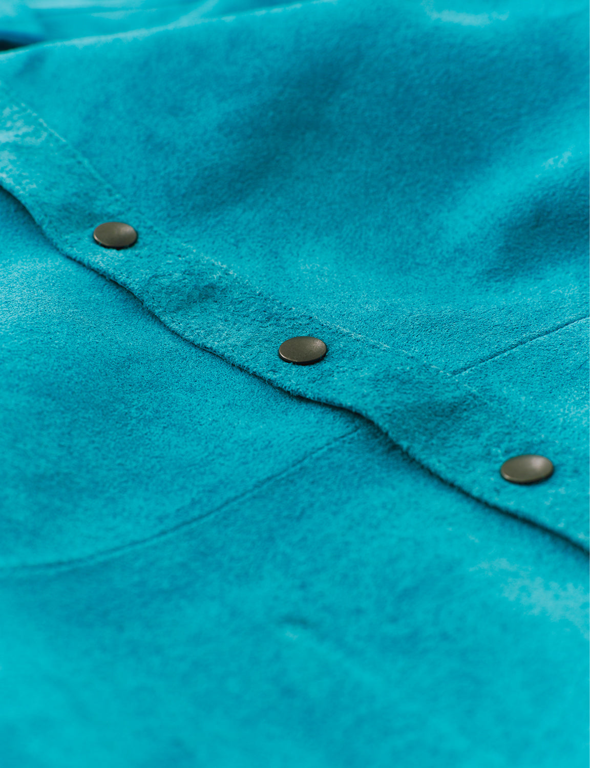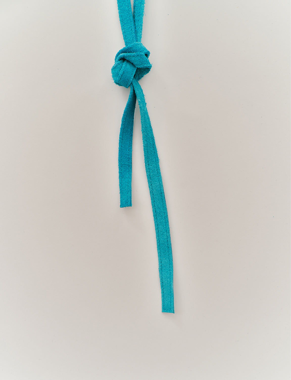 24SSから作り始めたゴールキーパーに着想を得たパターンを、 今回はターコイズ色のスエードで作りました。