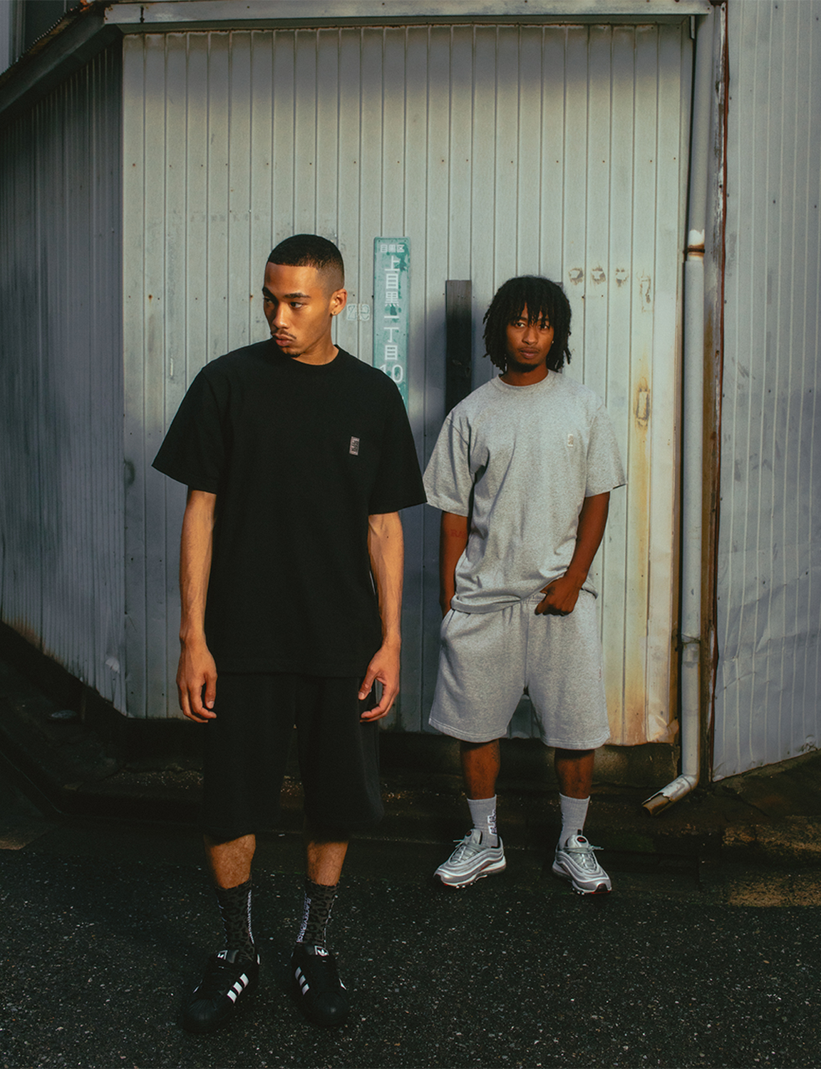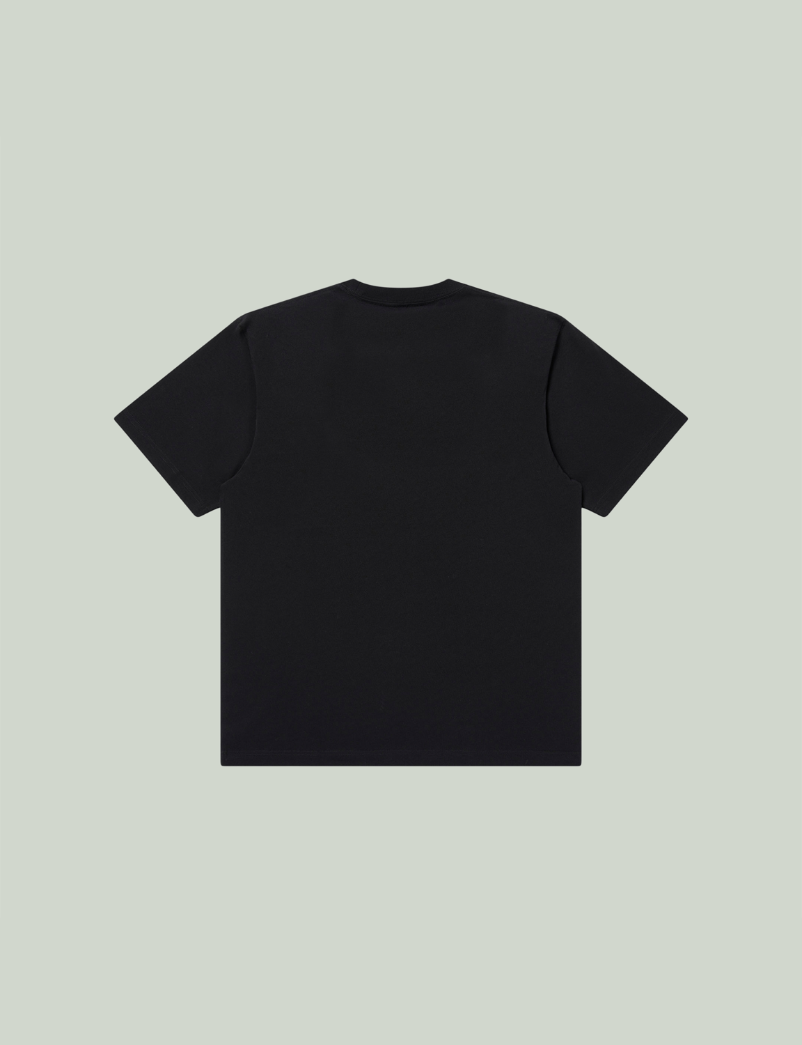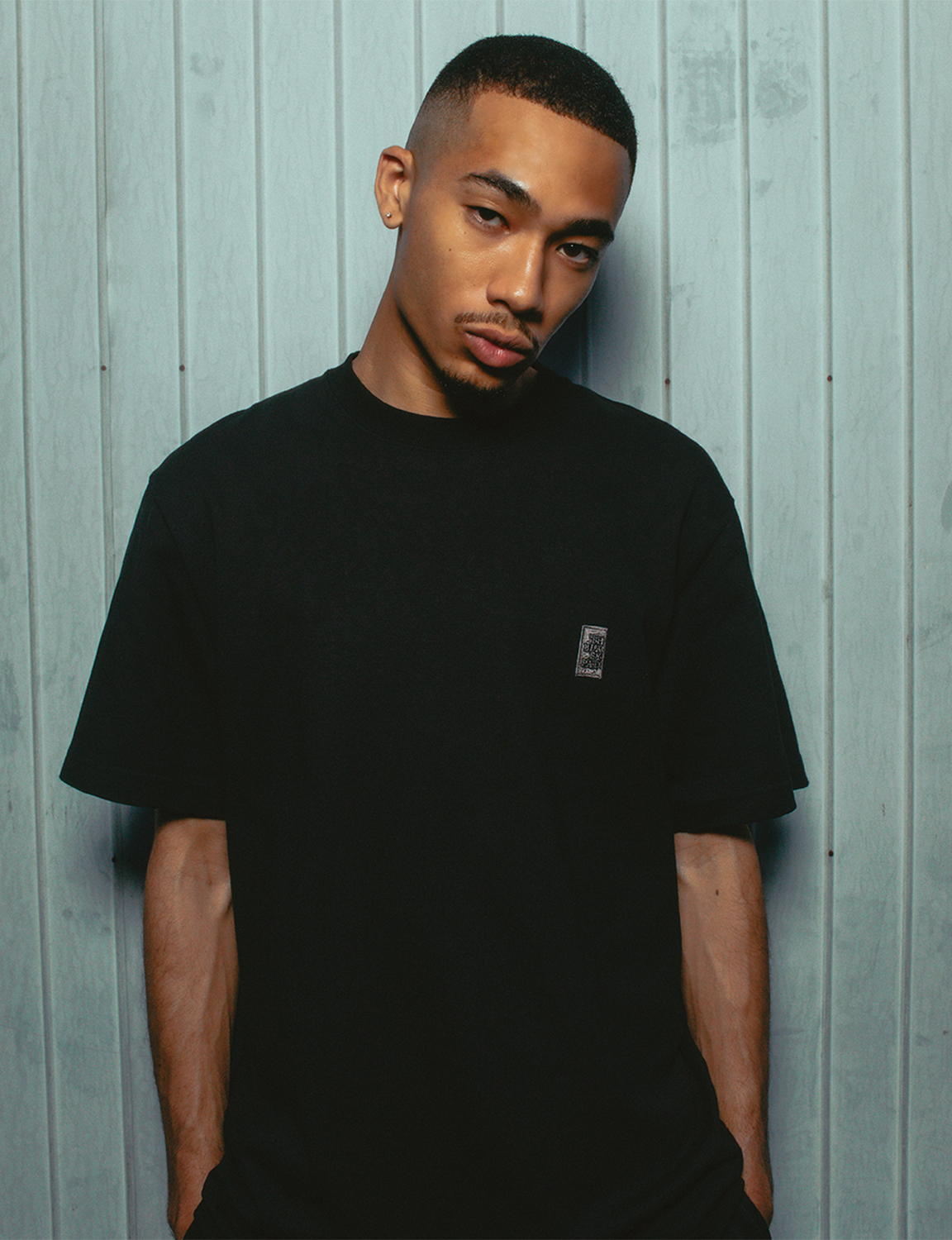左胸にボディと同系色の "取扱注意" ラベルロゴワッペンを配置したヘヴィウェイトの T シャツ。