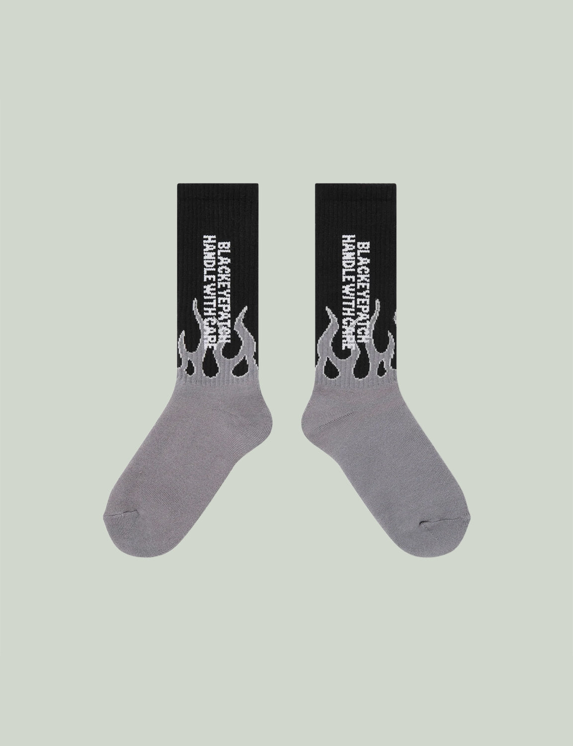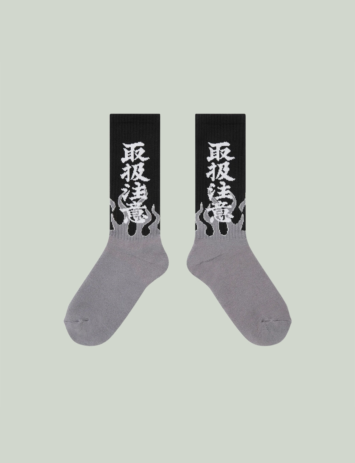 "取扱注意" のロゴとファイヤーパターンを組み合わせたグラフィックをダークトーンで編み込んだリブ編みのソックス。