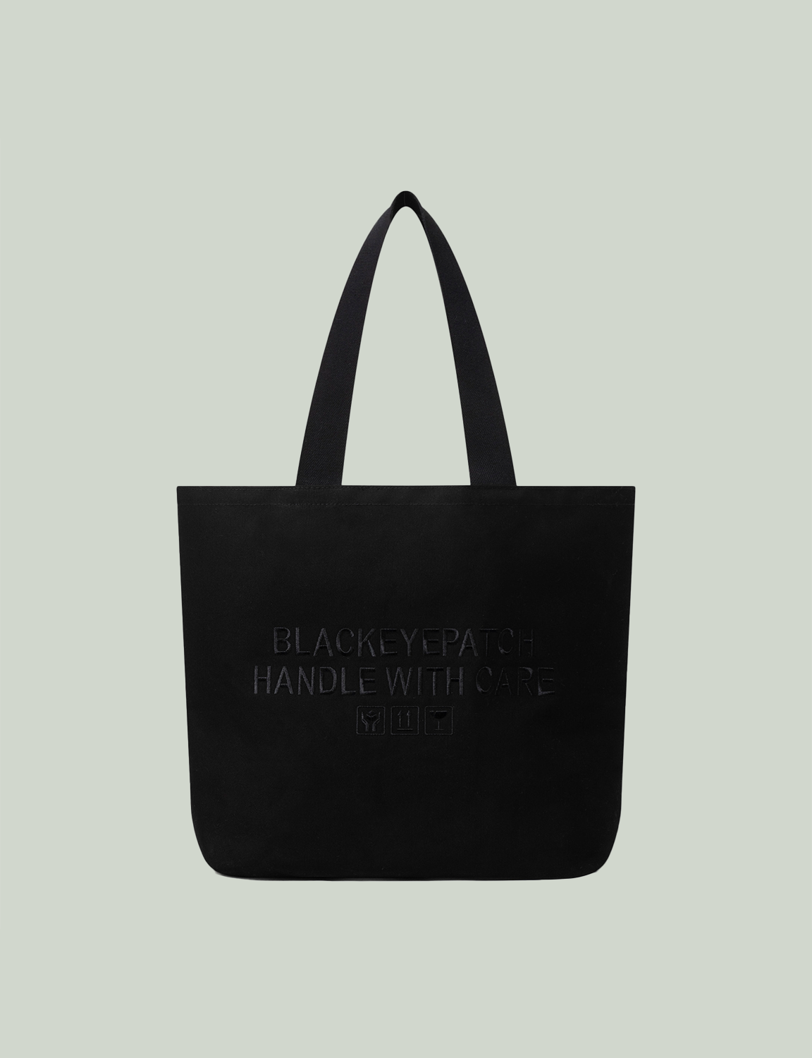 ボディと同系色の "取扱注意" ラベルロゴ刺繍を施したラージサイズのトートバッグ。