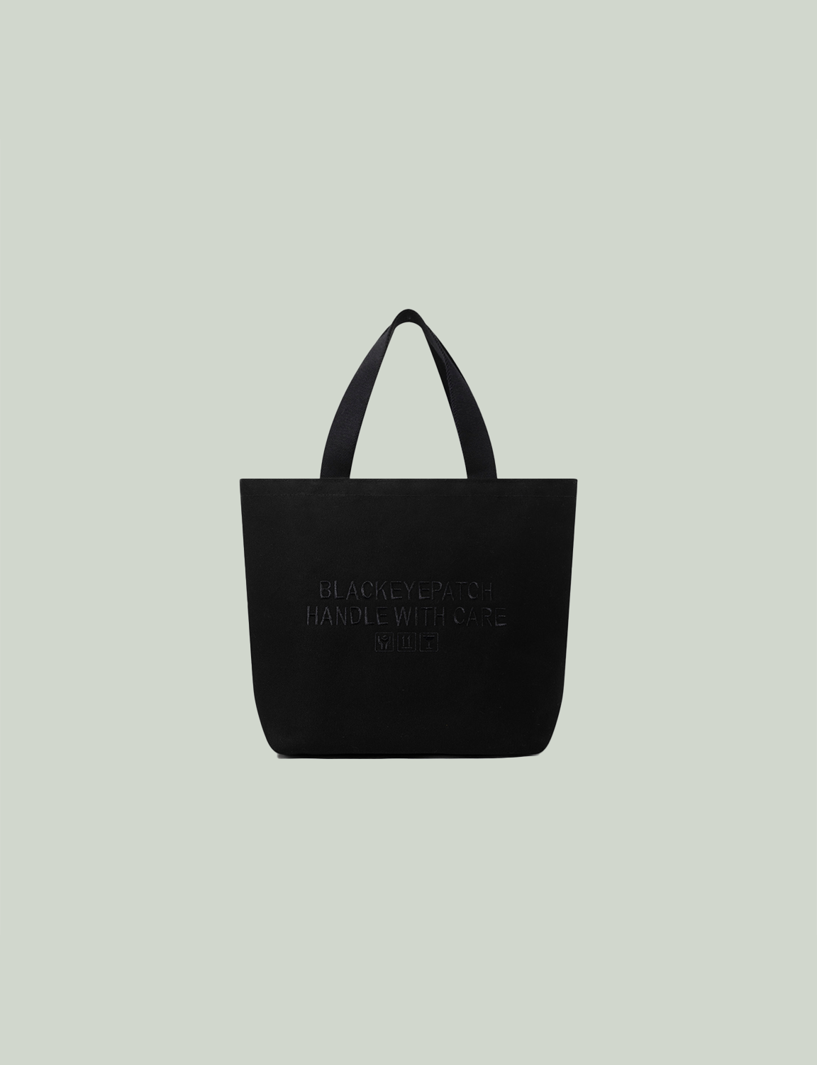 ボディと同系色の "取扱注意" ラベルロゴ刺繍を施したミディアムサイズのトートバッグ。