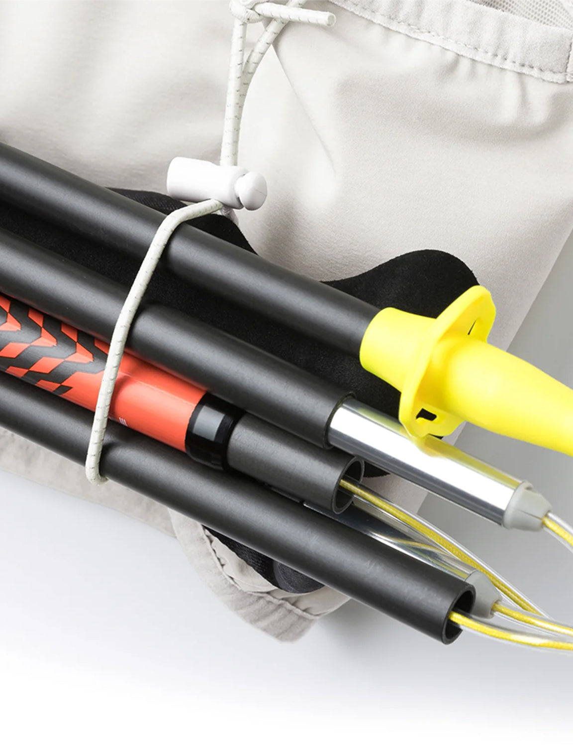 ソフトフラスクを固定するためのバンジーコードシステム。