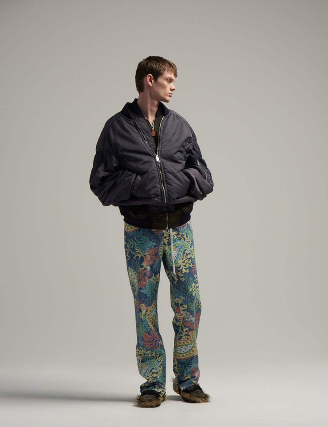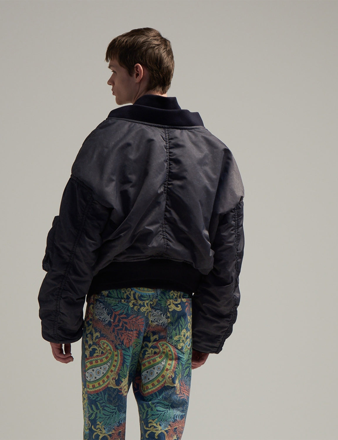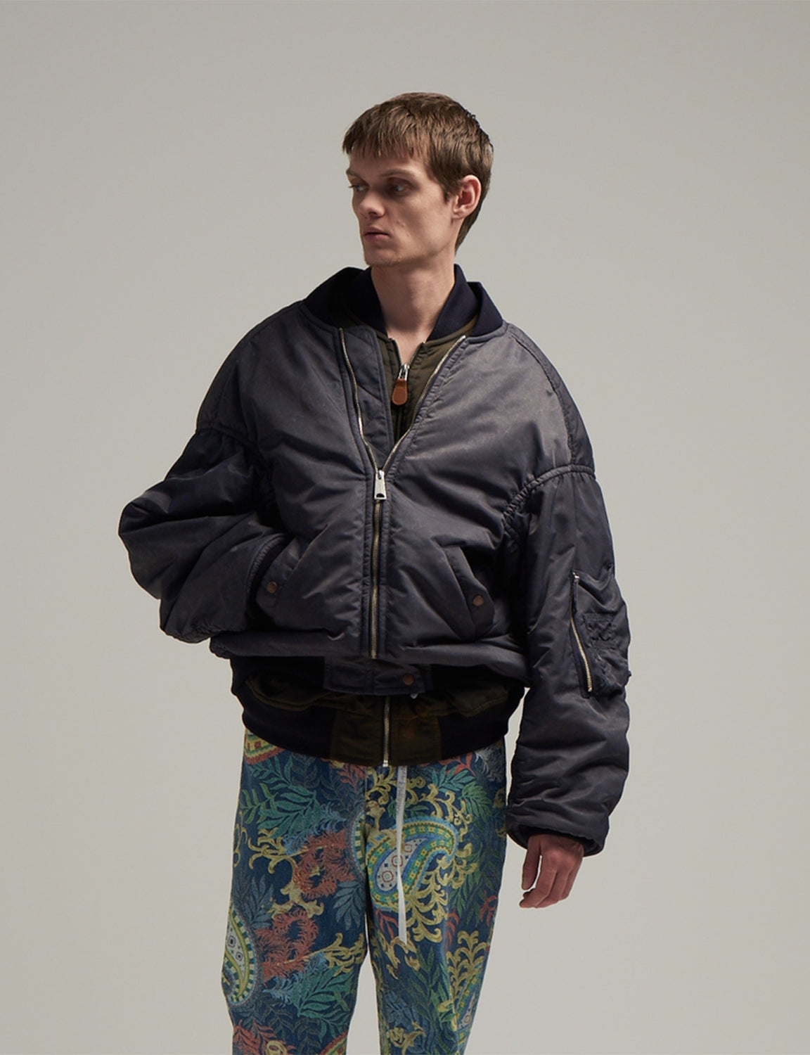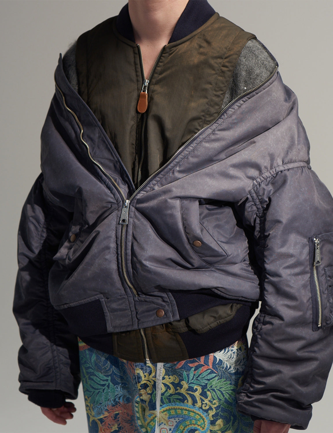 MA-1を重ね着しているように見えるデザインのブルゾン。内側にドッキングされたベストのみを着用すればMA-1を背面に垂らすように着用する事も可能。ブランドらしい遊びがある今期のアイテムの中でも注目度の高い本作は、肉感のあるナイロンツイルに顔料コーティングのプリント加工をし、その後洗いにかけることでムラのある表情に仕上がった。