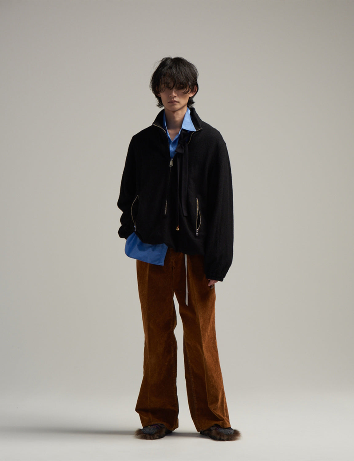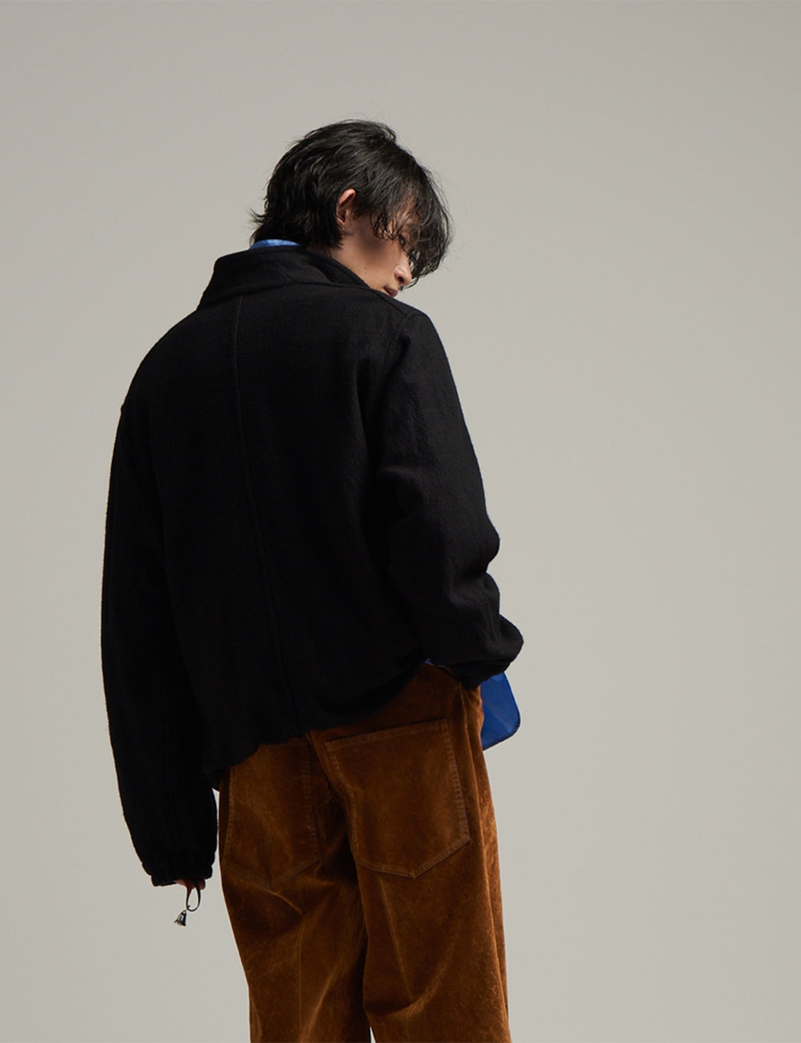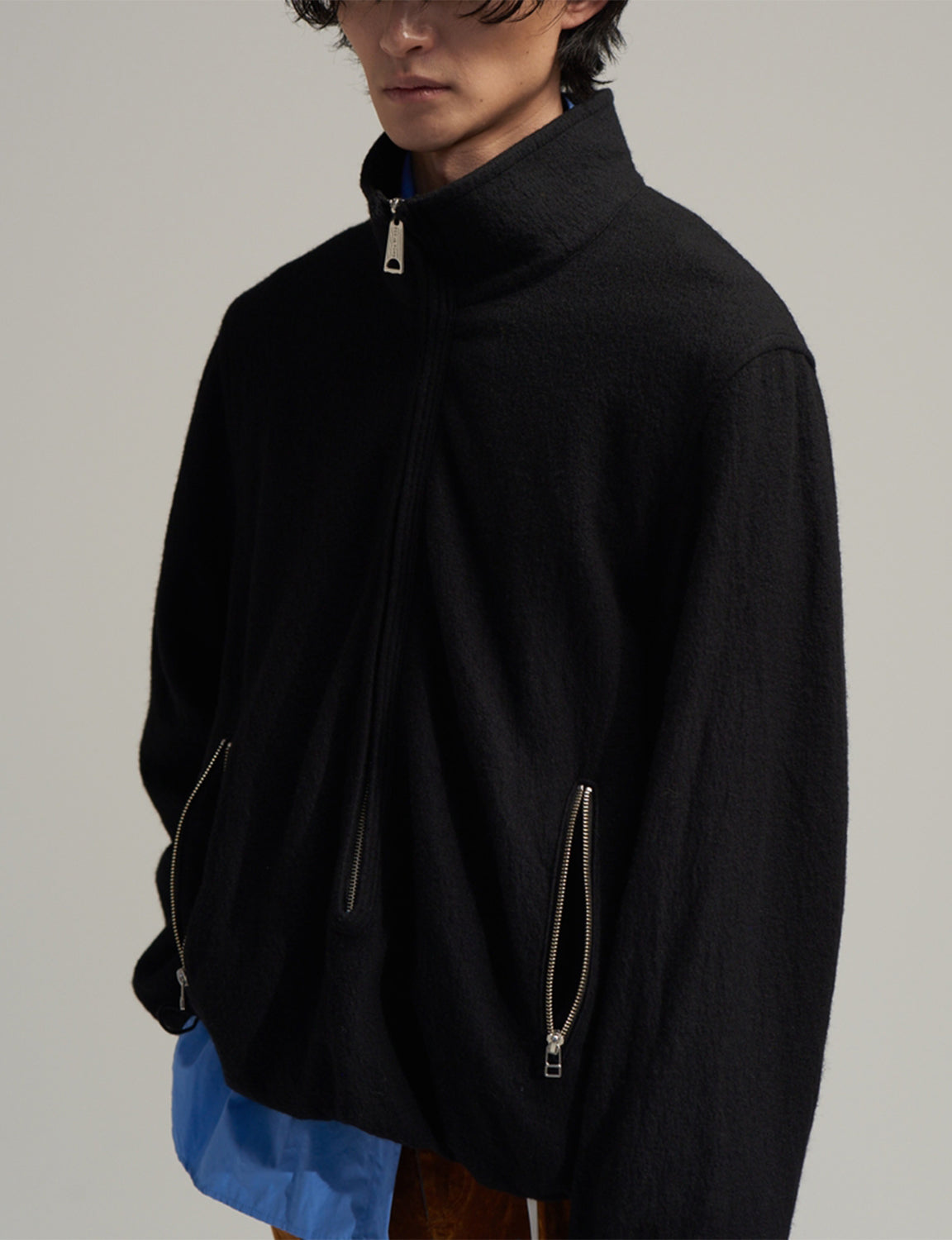 長めのフロントファスナーが目を惹くプルオーバーのブルゾン。生地は梳毛糸を使ったウール天竺を使用しクレーター加工をしている為、陰影がありムードを感じられる表情に仕上がりに。起毛感があり、馴染みの良いソフトな風合いで、裾にはドローコードを配し、シルエットの調整も可能な使い勝手の良い、いわば"ノーストレス"な1着。
