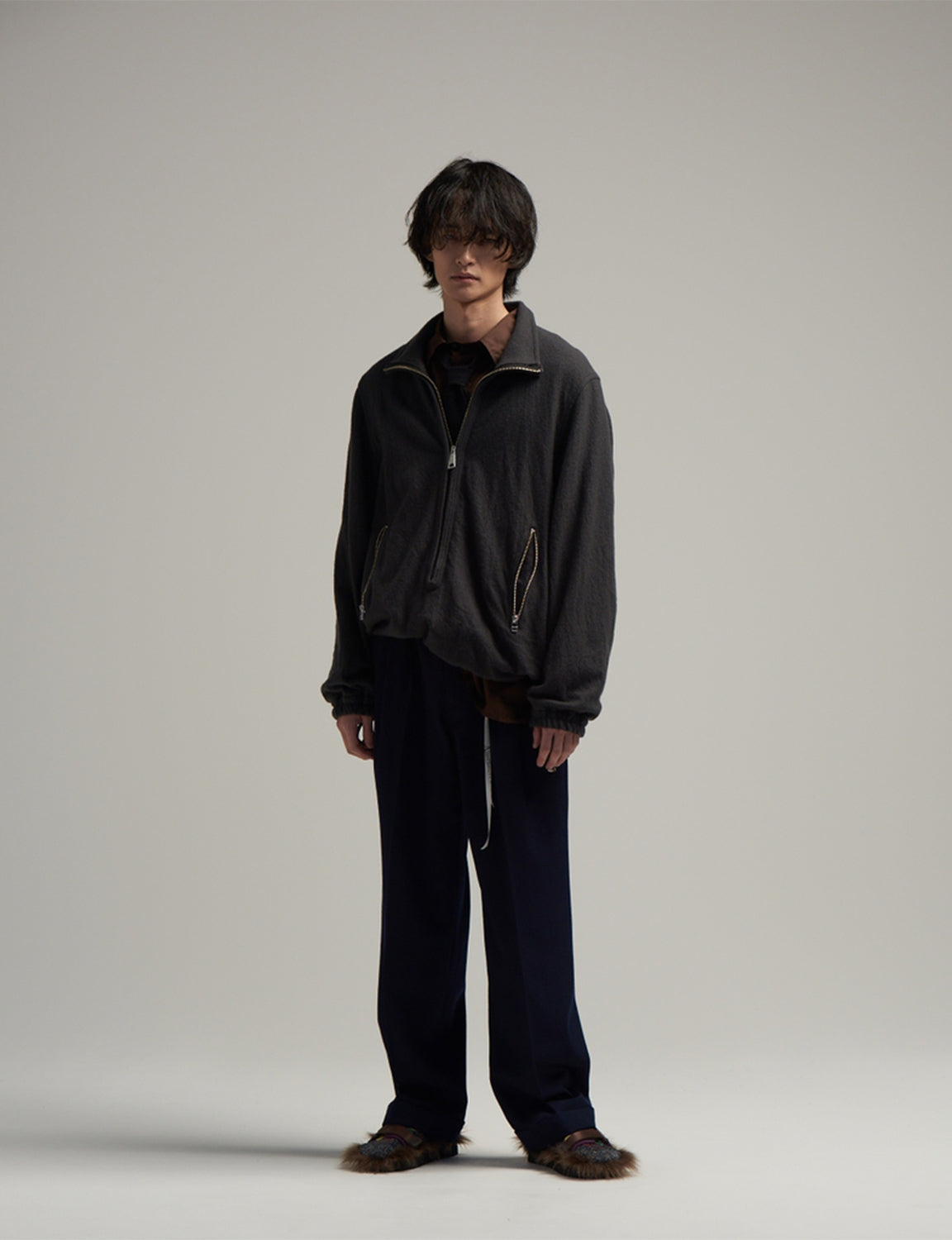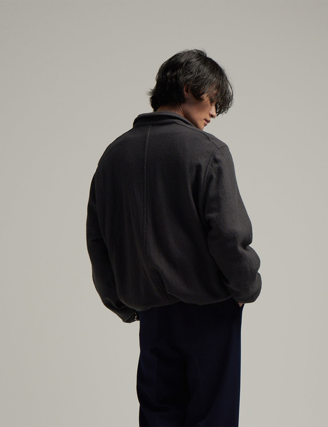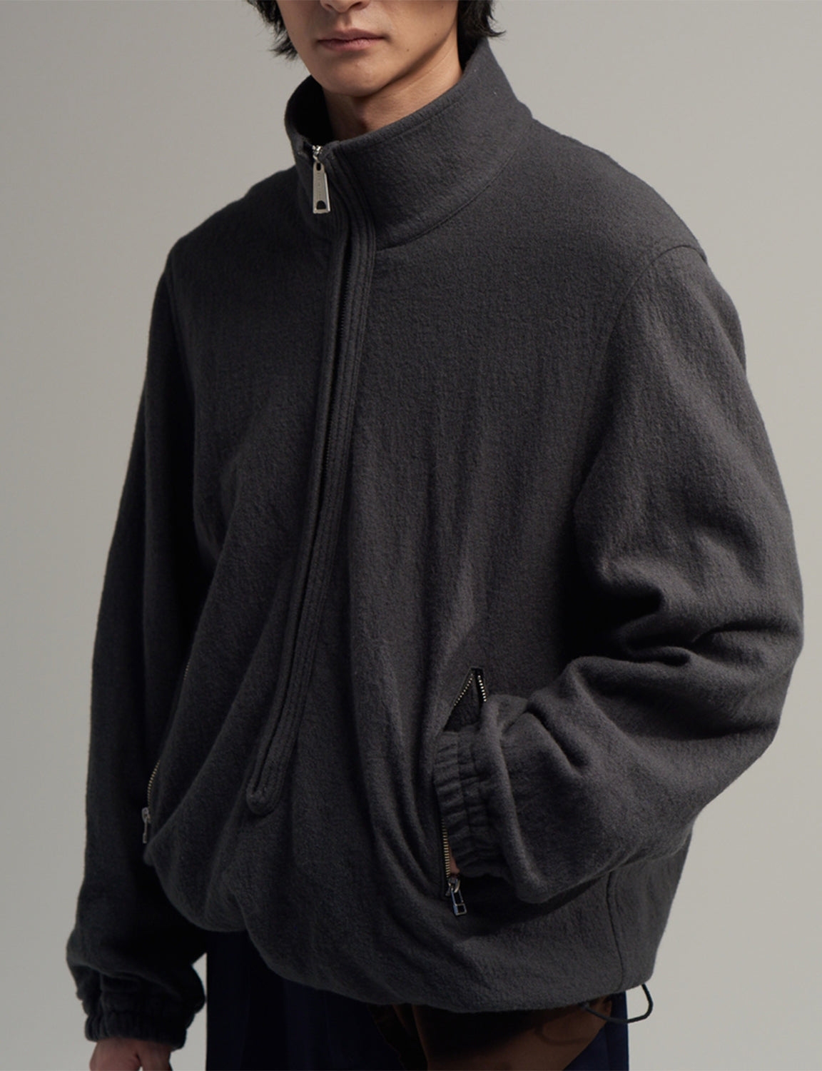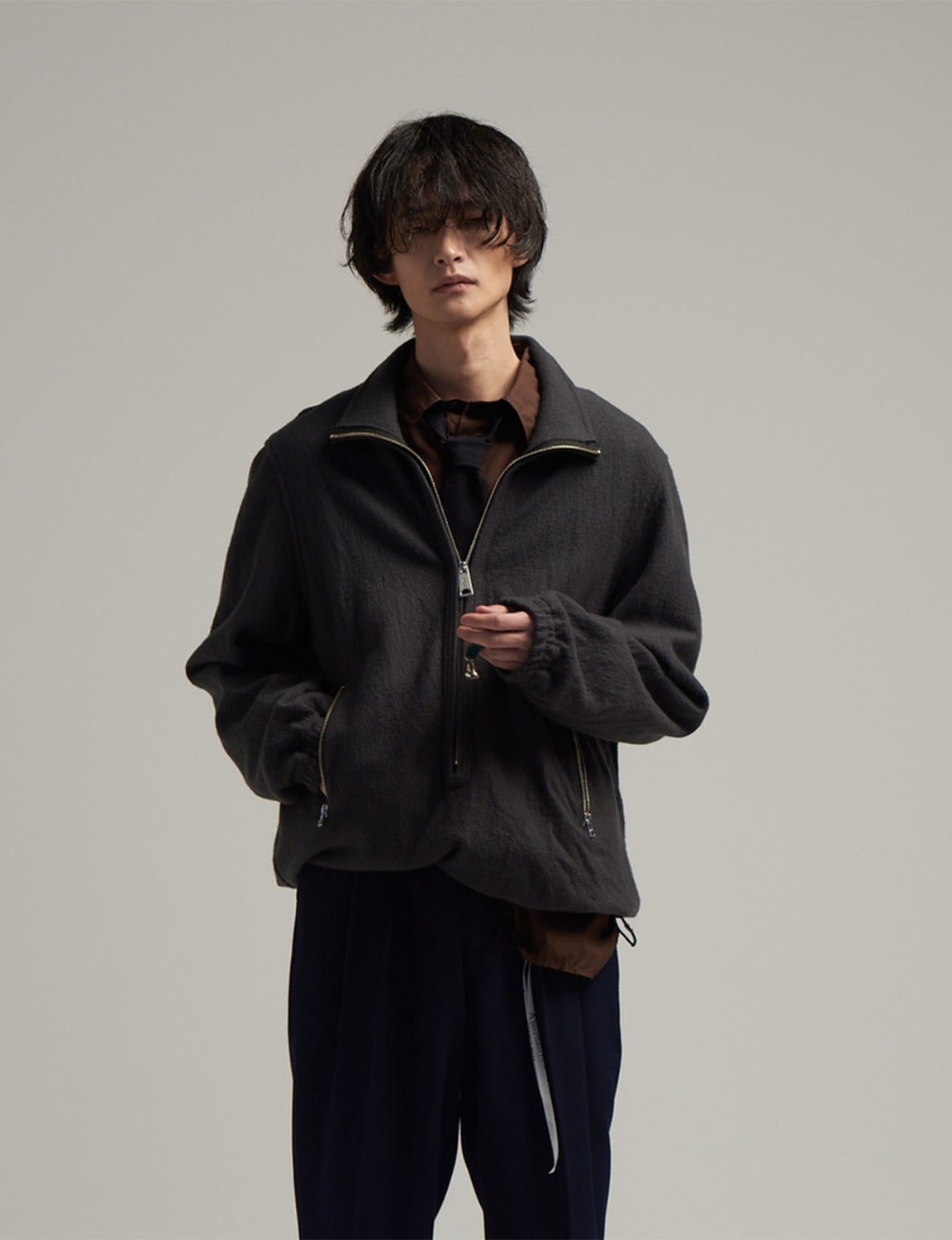 長めのフロントファスナーが目を惹くプルオーバーのブルゾン。生地は梳毛糸を使ったウール天竺を使用しクレーター加工をしている為、陰影がありムードを感じられる表情に仕上がりに。起毛感があり、馴染みの良いソフトな風合いで、裾にはドローコードを配し、シルエットの調整も可能な使い勝手の良い、いわば"ノーストレス"な1着。