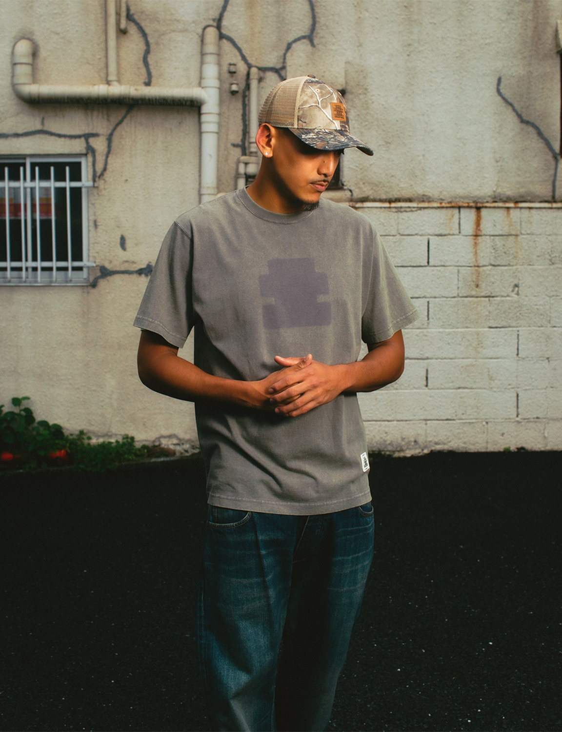 バイオ加工によって "OG LABEL" ロゴのシルエットを表現した T シャツ。
