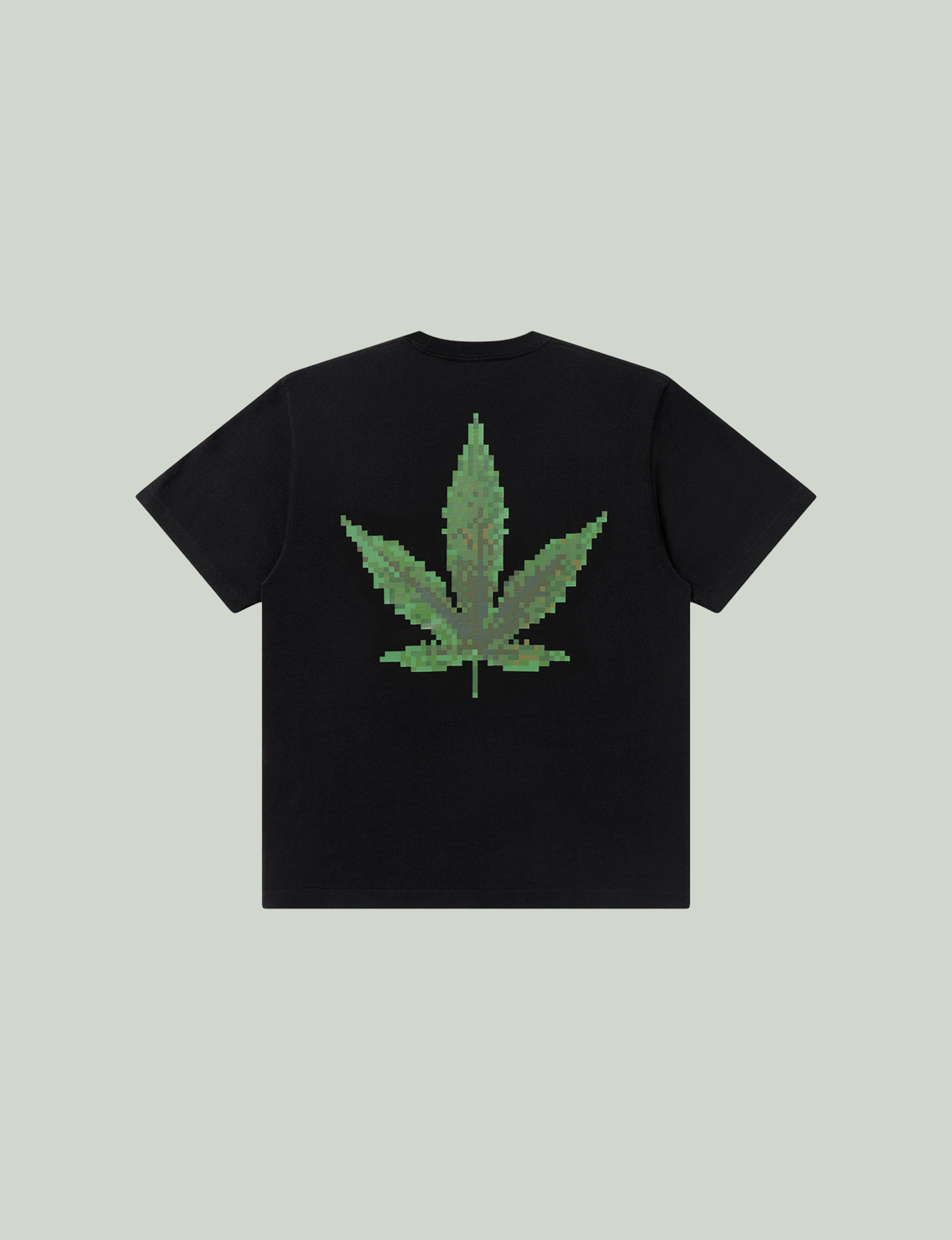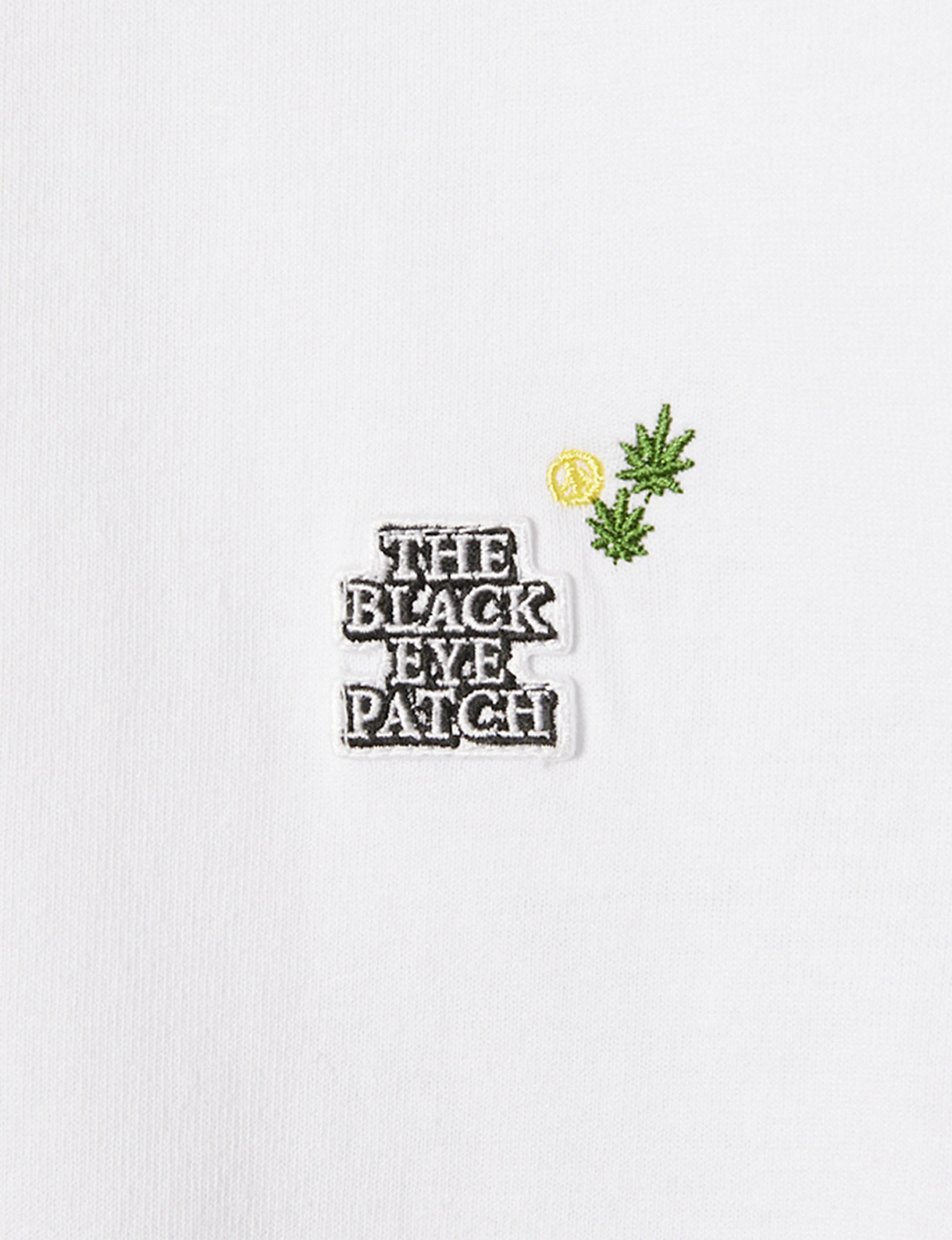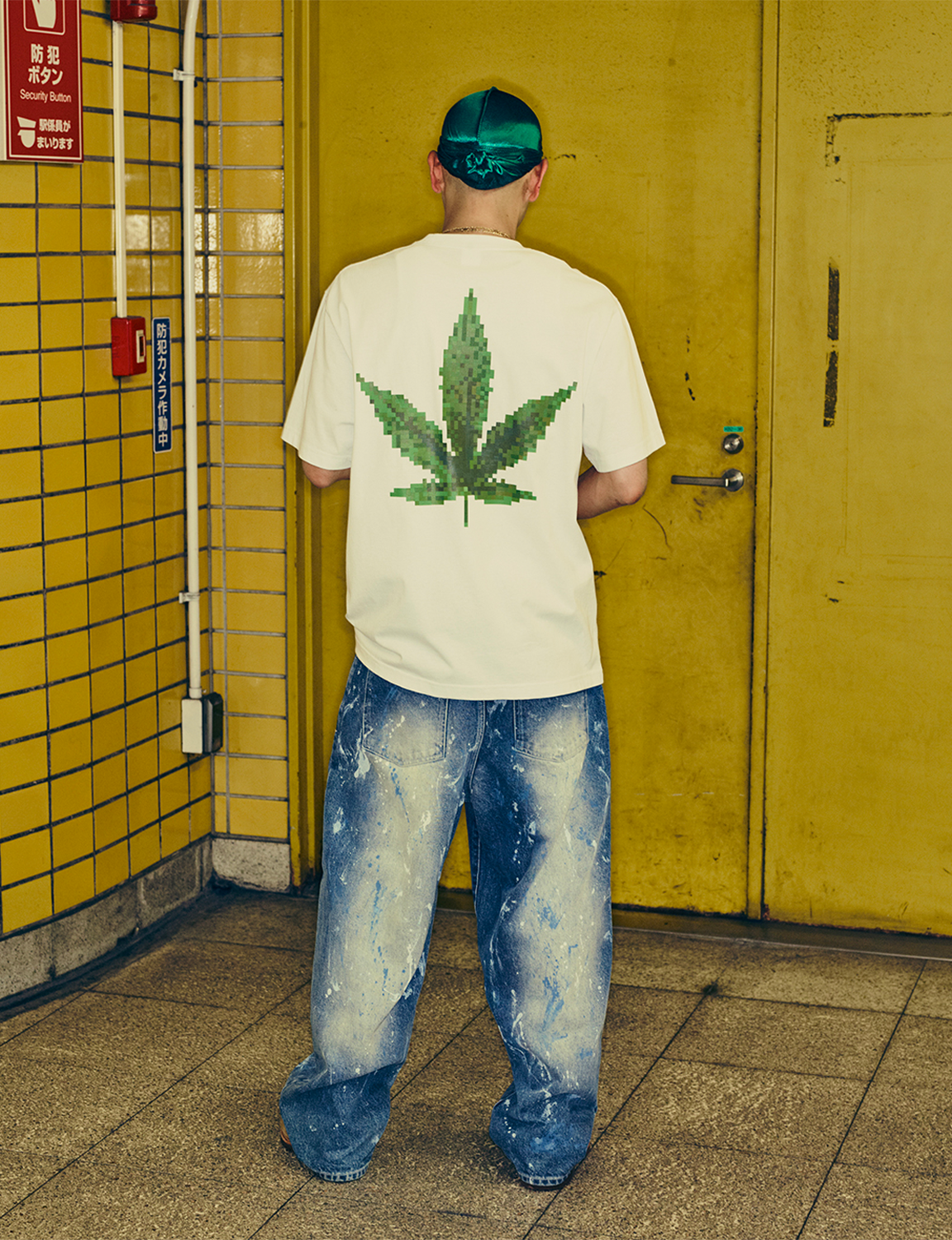 "SMALL OG LABEL" のロゴワッペンのサイドにピースマークやリーフの刺繍を施し、背面にはモザイクをかけたリーフモチーフのグラフィックをプリントした T シャツ。
