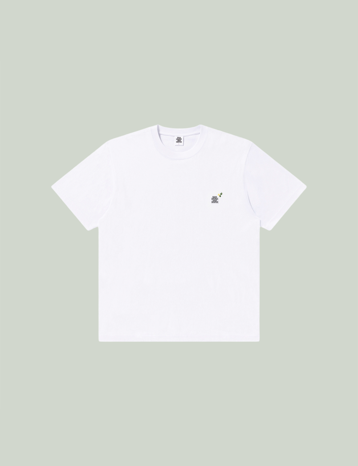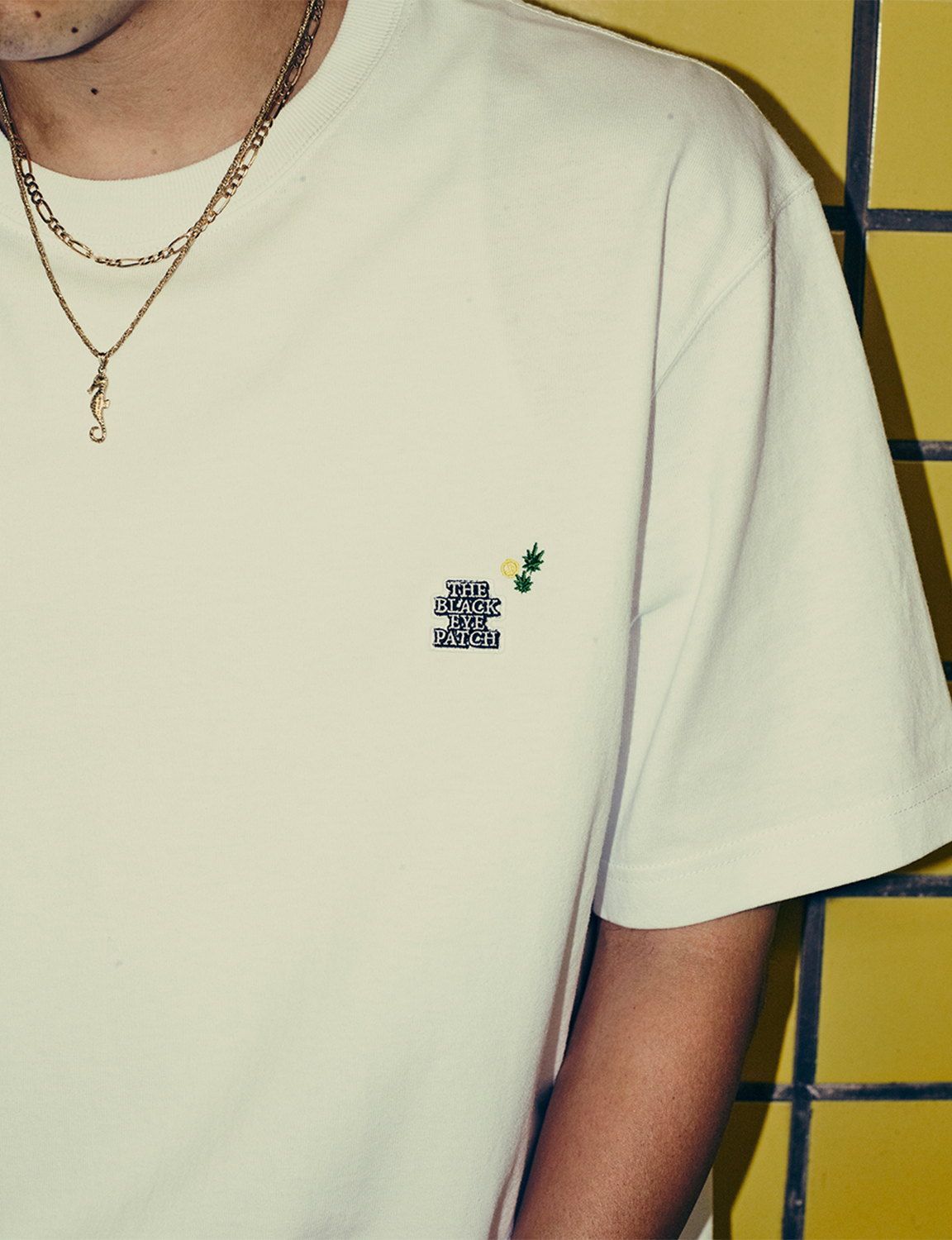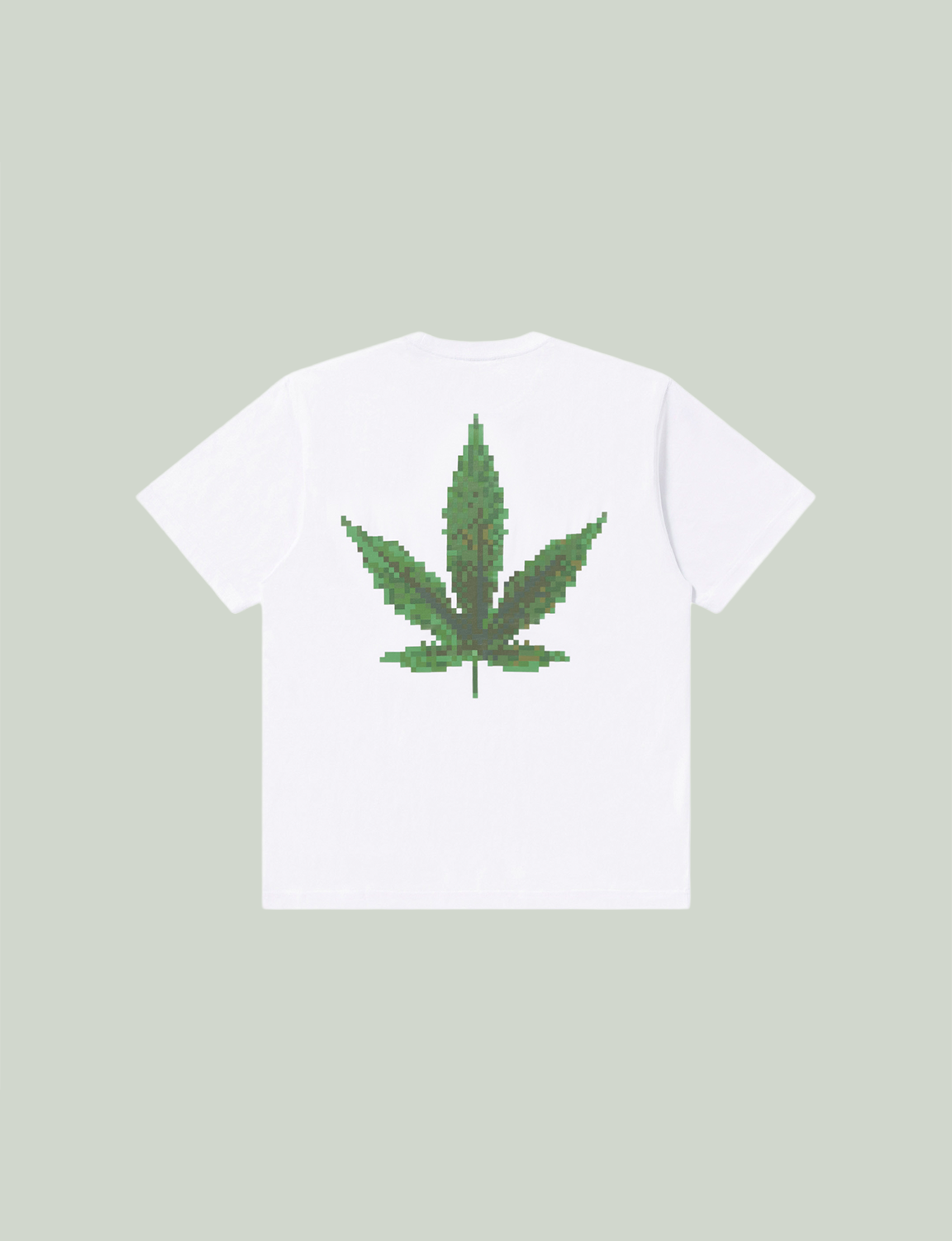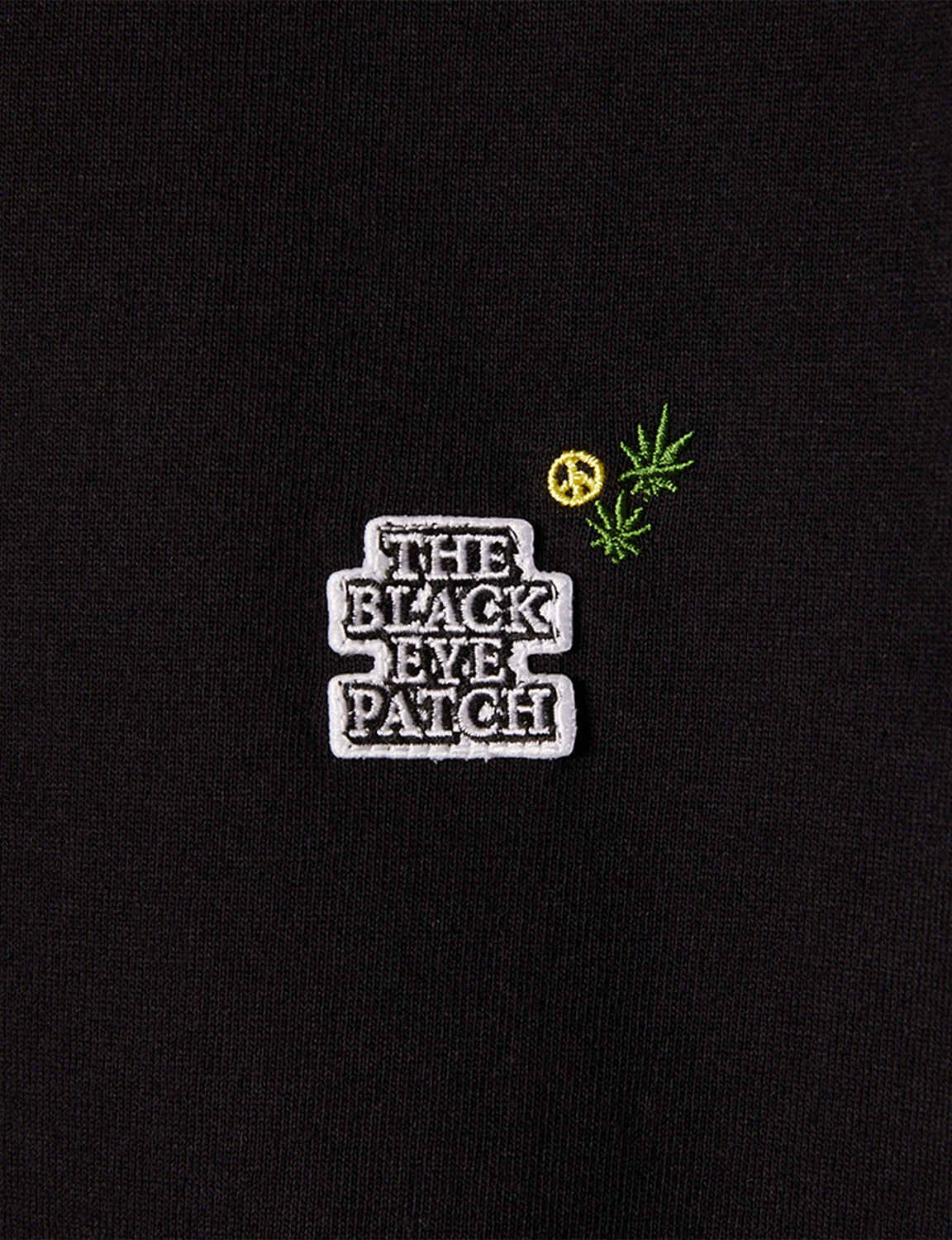 "SMALL OG LABEL" のロゴワッペンのサイドにピースマークやリーフの刺繍を施し、背面にはモザイクをかけたリーフモチーフのグラフィックをプリントした T シャツ。