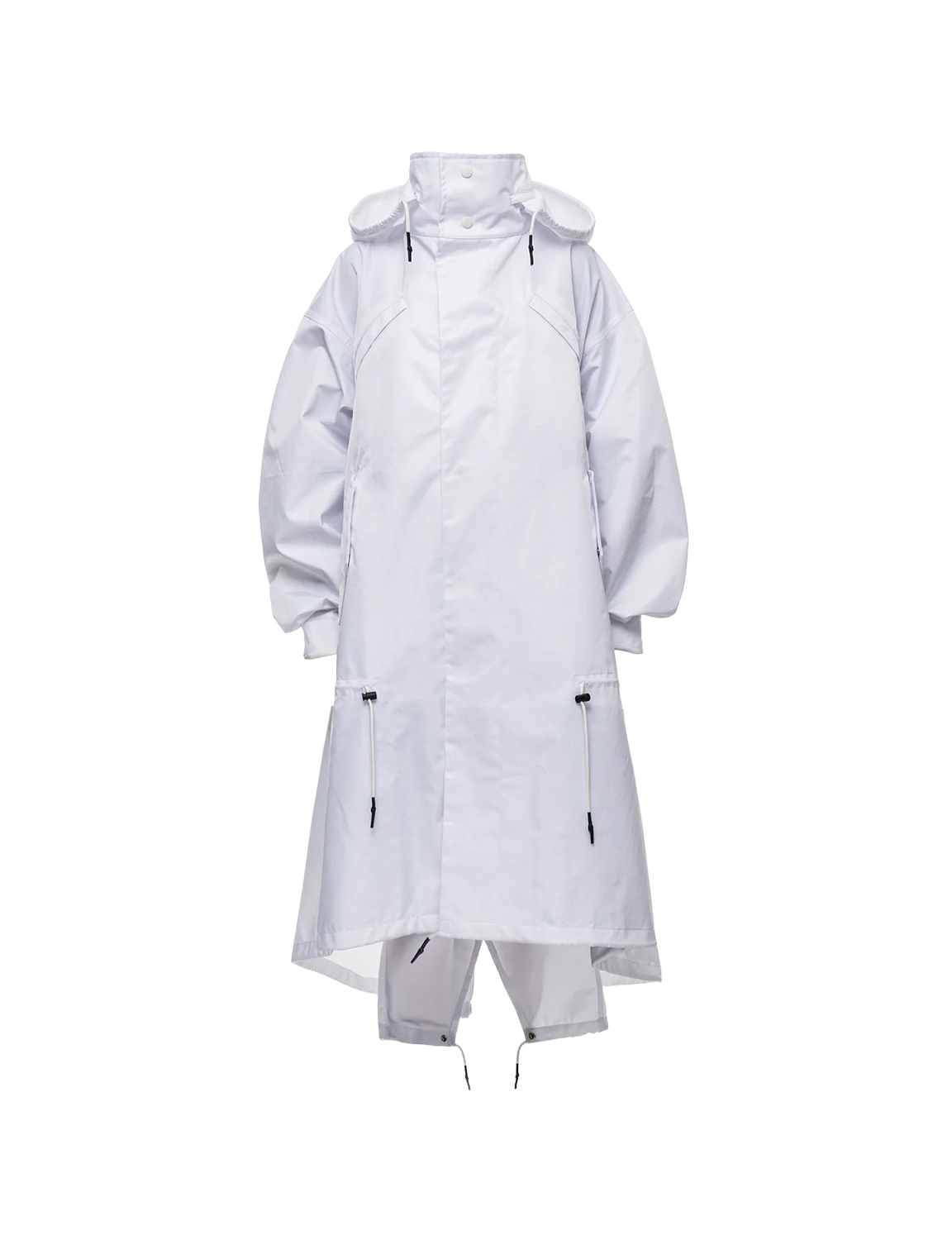フード、ウエスト、裾の3点でシルエットを調整できるギャザーデザインが機能性とファッション性を両立させる。