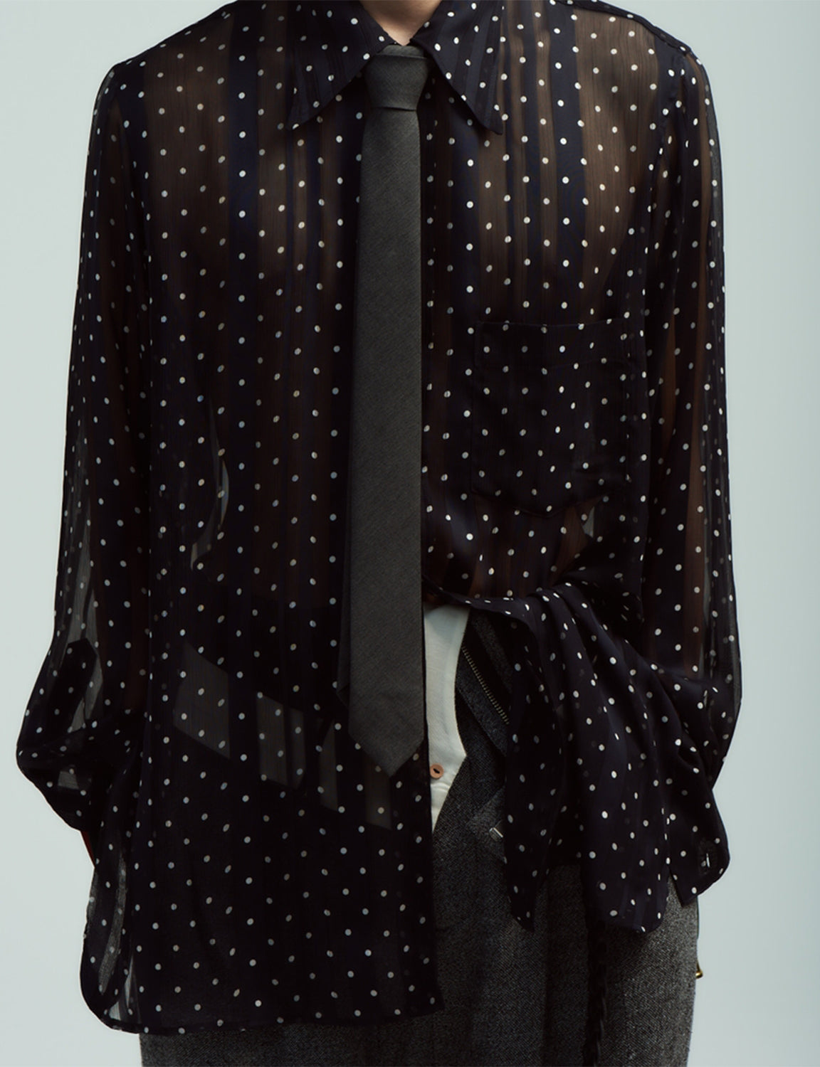 細番手の糸を使った透け感のある楊柳と、サテンのコントラストが特徴的です。